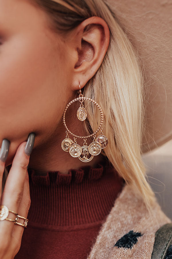 If you like your money where you can see it, then you'll want to accessorize with our luxe 'Best Guess' statement earrings featuring large gold hoops with dangling coin charm accents!