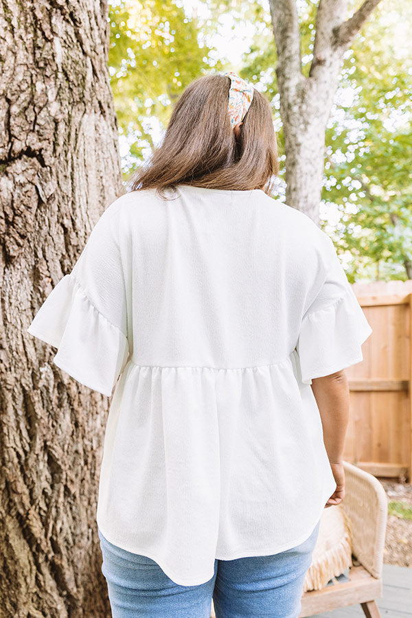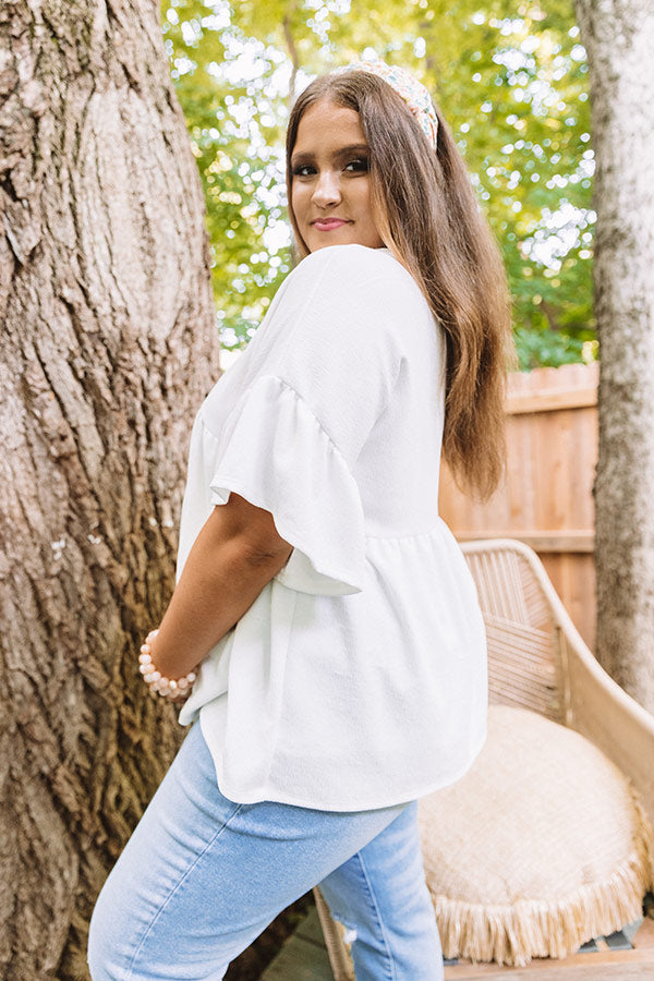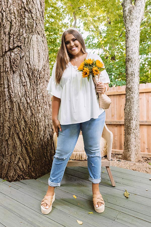 Plus Size - Our chic white 'Best Kept Beautiful' top features lightweight flowy material, a v-cut neckline with lave trim detailing and a tie closure, loose short sleeves with flared cuffs, and a relaxed babydoll silhouette that falls into a straight hemline! Measurements