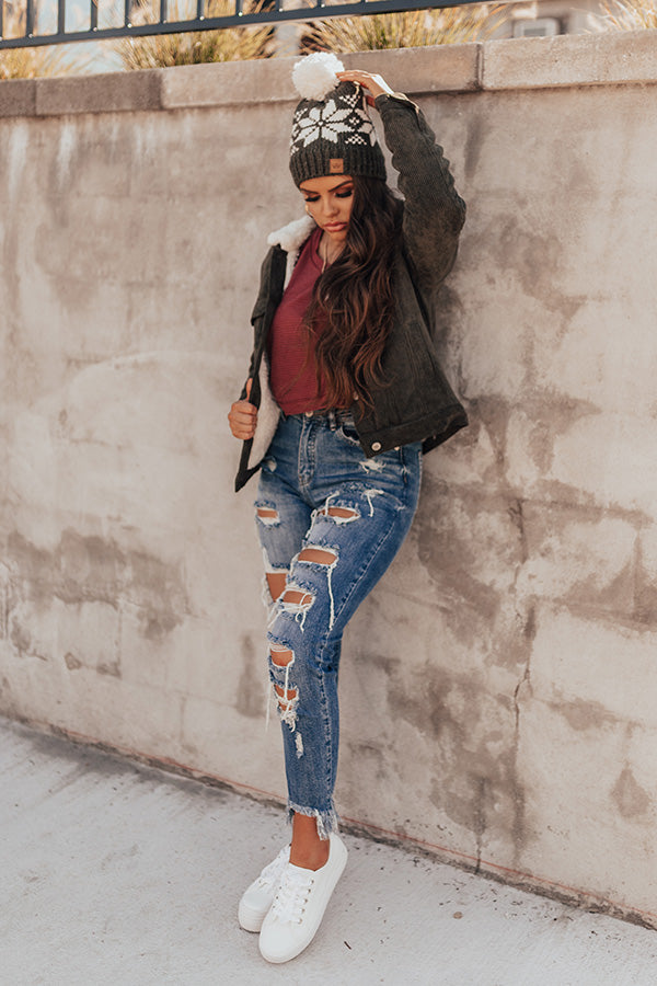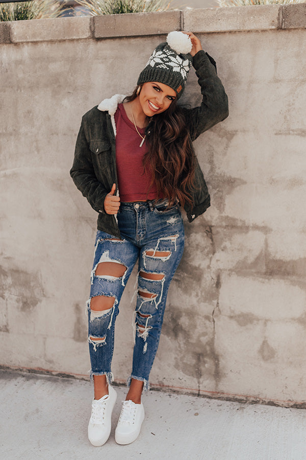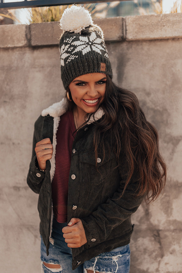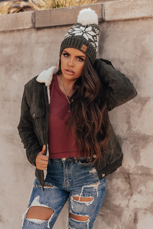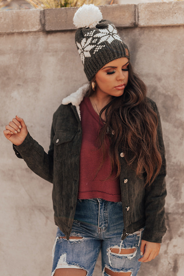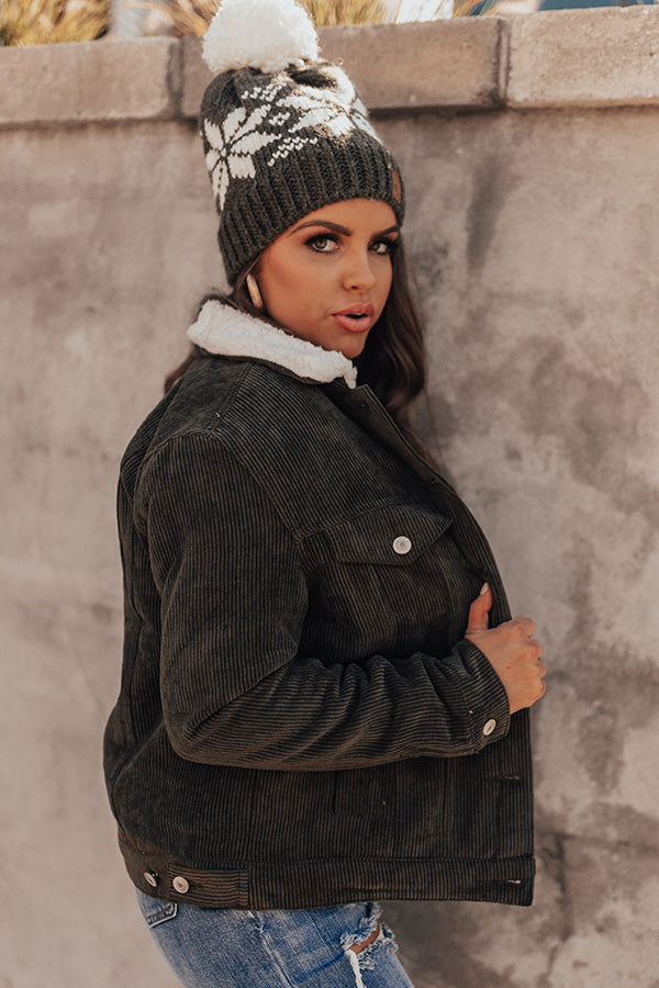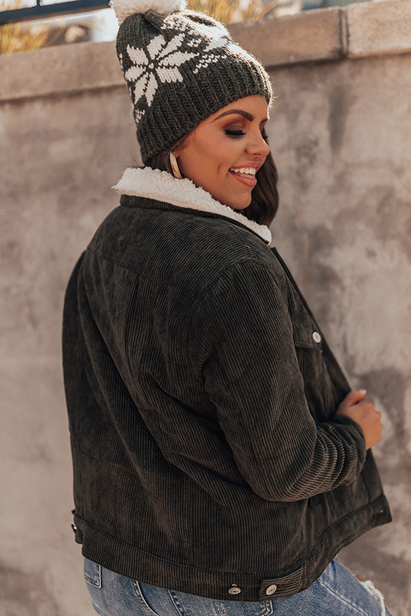 This adorable dark olive colored jacket will be the best at keeping you cozy with its soft lightweight corduroy material, super soft sherpa lining, long loose sleeves with button closure cuffs, a button down front with a collared neckline, accent side pockets and chest pockets with flap closures, and a relaxed silhouette that falls into a straight hemline! Measurements