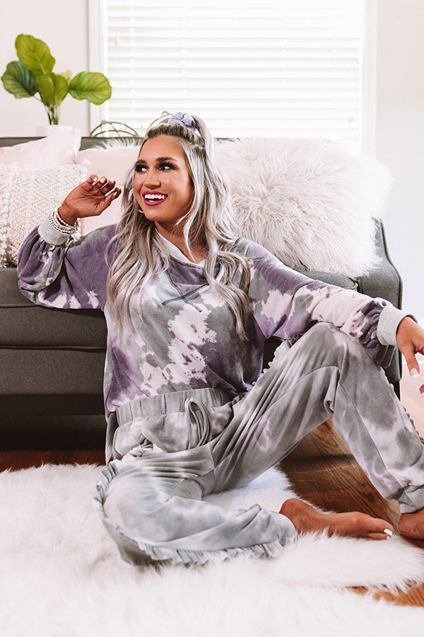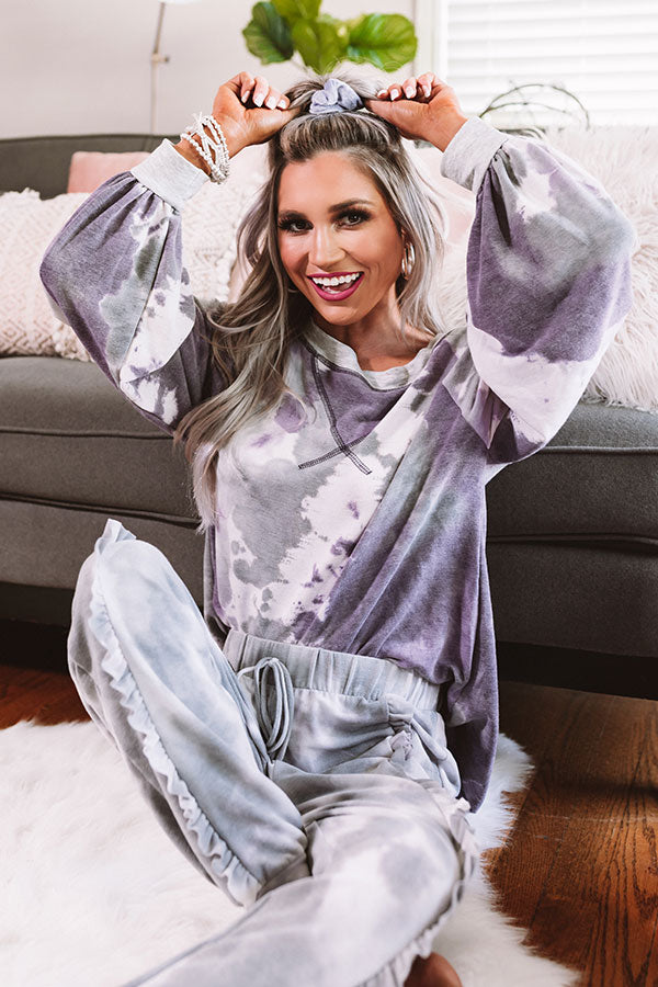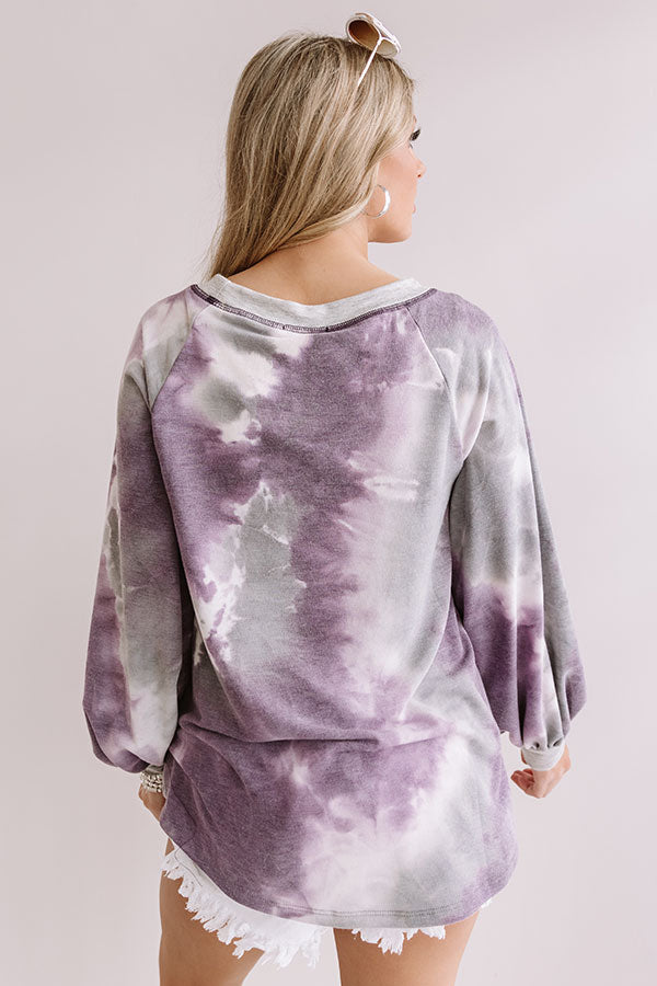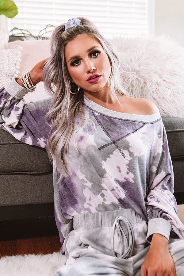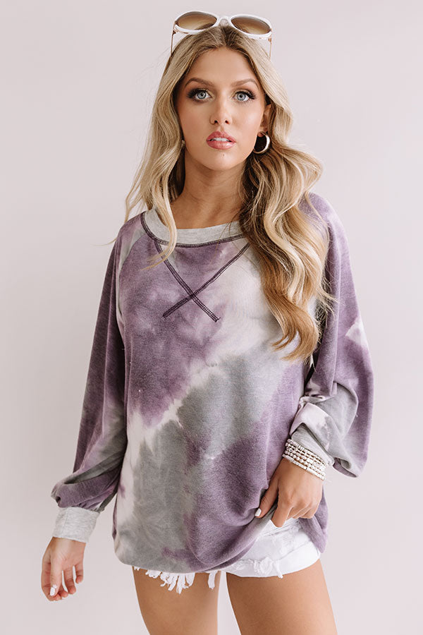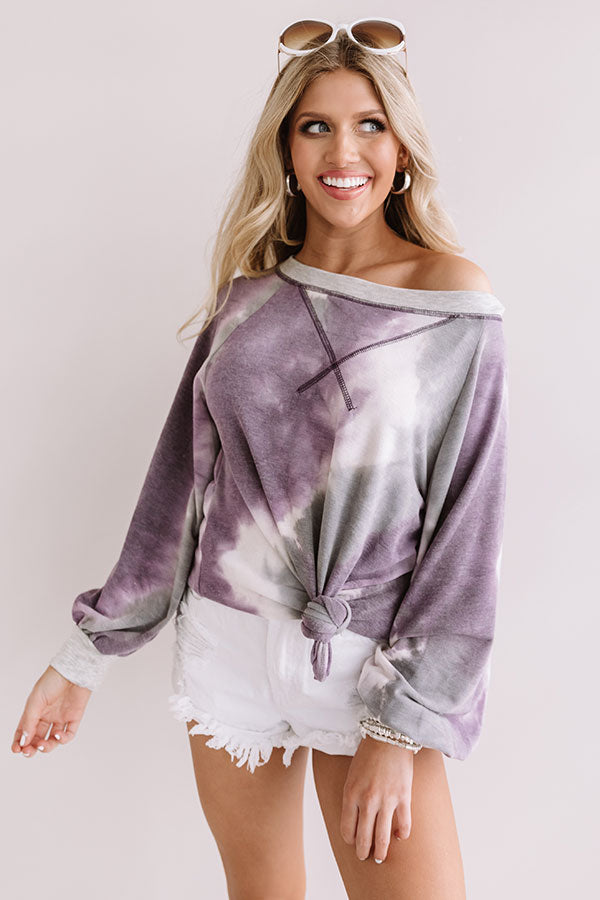 This fun sweatshirt is the "best of all" with its soft lightweight material patterned with a purple and grey hued tie dye, a wide rounded neckline that can be worn off one shoulder, dark purple accent sleeves, long oversized sleeves with fitted cuffs, and a relaxed silhouette that falls into a straight hemline that can be knotted! We have styled this cozy but casual cutie with some frayed white shorts, sunnies, and a neutral wedges, but you can also wear it with some matching joggers or distressed skinnies, "The Karlie Perforated Bootie in Grey," and our "Champagne And Chic Faux Leather Crossbody in Heirloom Lilac!" Measurements