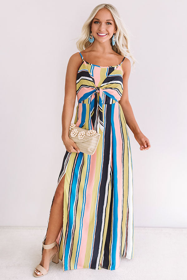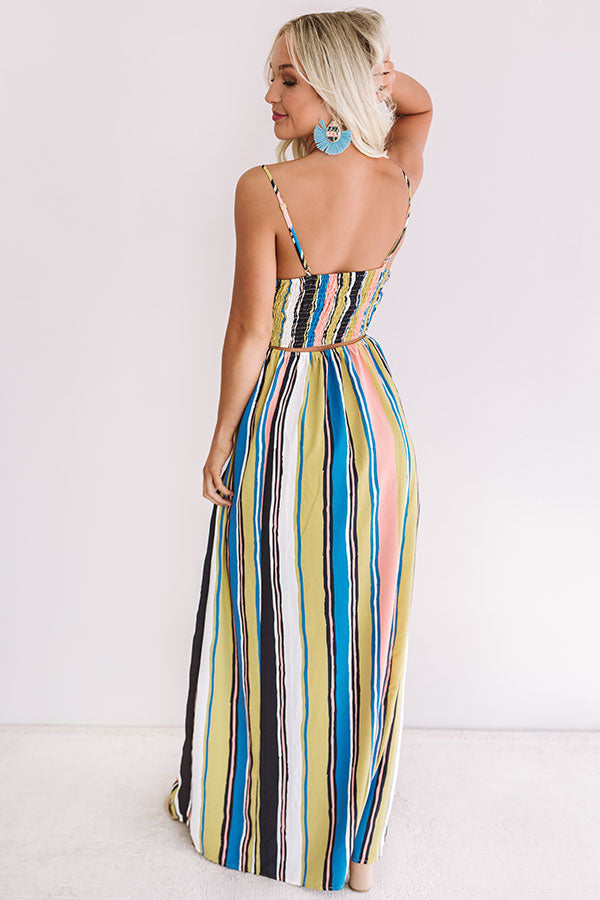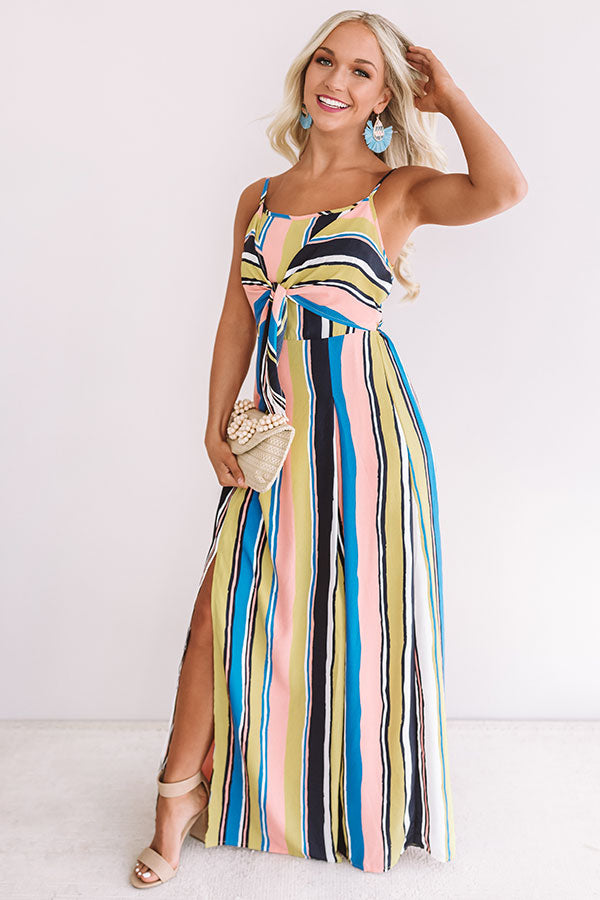 This colorfully striped maxi will be your best one yet with its spaghetti straps, front bow accent, and knee high slit! PLUS, it features a two-piece back with a smocked panel across the shoulders and a separate elastic skirt waistband that connects under the arm. Style with neutral heels and a small clutch for a polished but "I didn't try too hard" summer look! Measurements