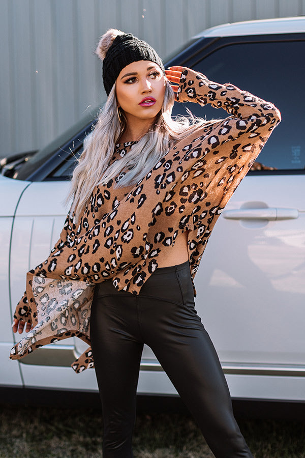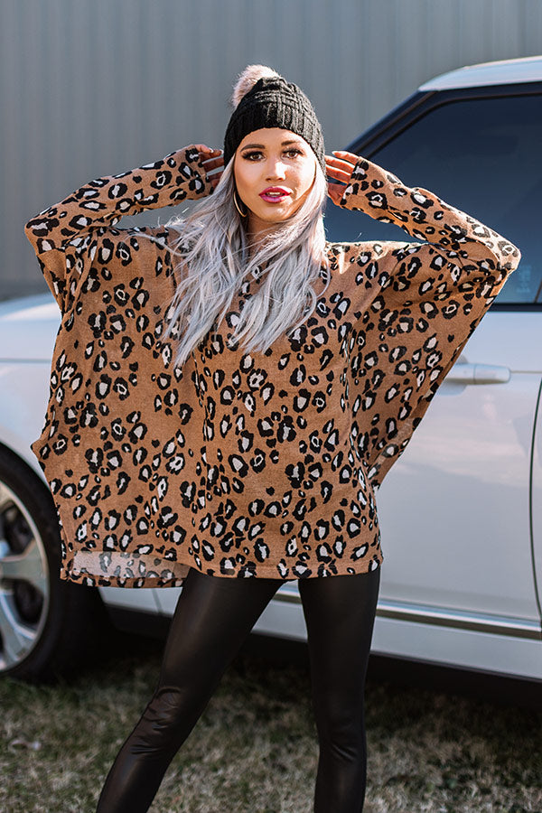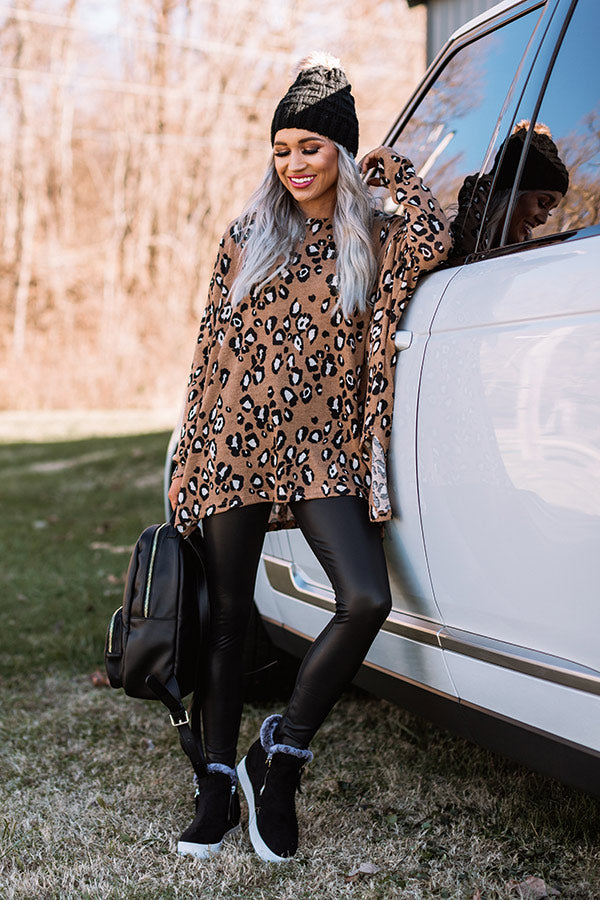 Put your best style foot forward with this adorable brown tunic featuring soft lightweight flowy material patterned with a bold black and white leopard print, a high rounded neckline, long loose sleeves, and an ultra draped silhouette that falls into a straight upper-thigh length hemline!