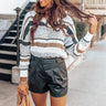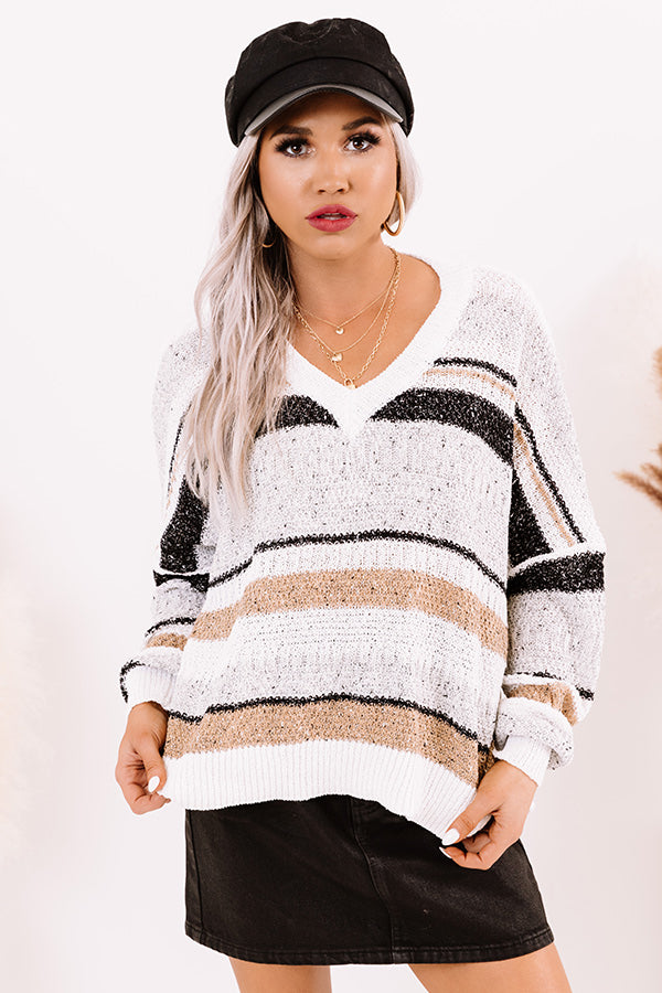 We guarantee you will want to pack this adorable white sweater for all your best travels with its soft lightweight tight knit material, horizontal black and neutral stripes, a v-cut neckline that can be worn off one shoulder, long loose sleeves with fitted cuffs, a slouched silhouette that falls into a straight hemline with accent side slits!