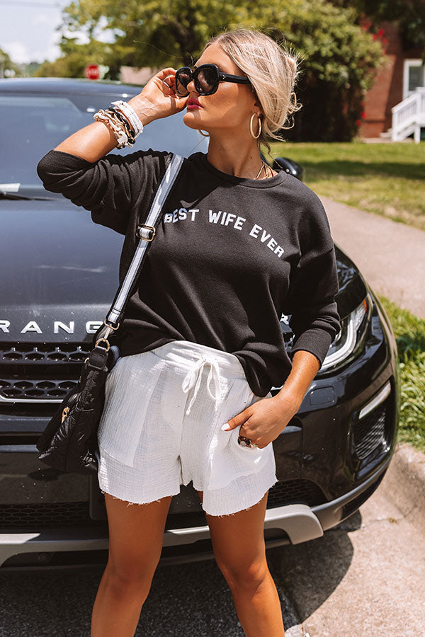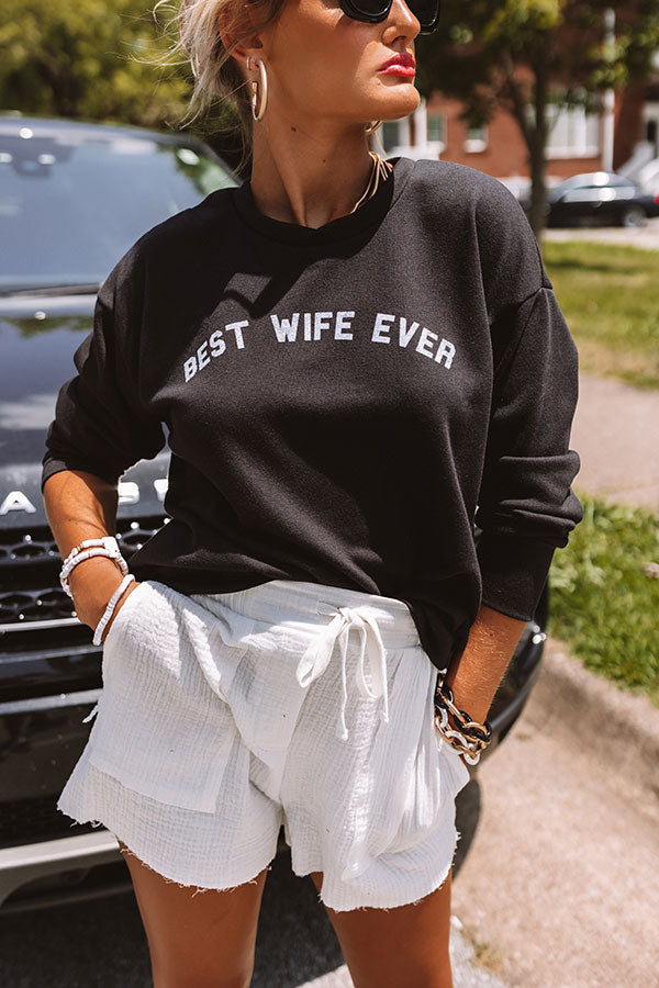 Make a statement in our adorable black 'Best Wife Ever Sweatshirt' featuring soft lightweight material with cute white block lettering on the front, a rounded neckline, long loose sleeves with fitted cuffs, and a slouched silhouette that ends in a straight hemline! Measurements