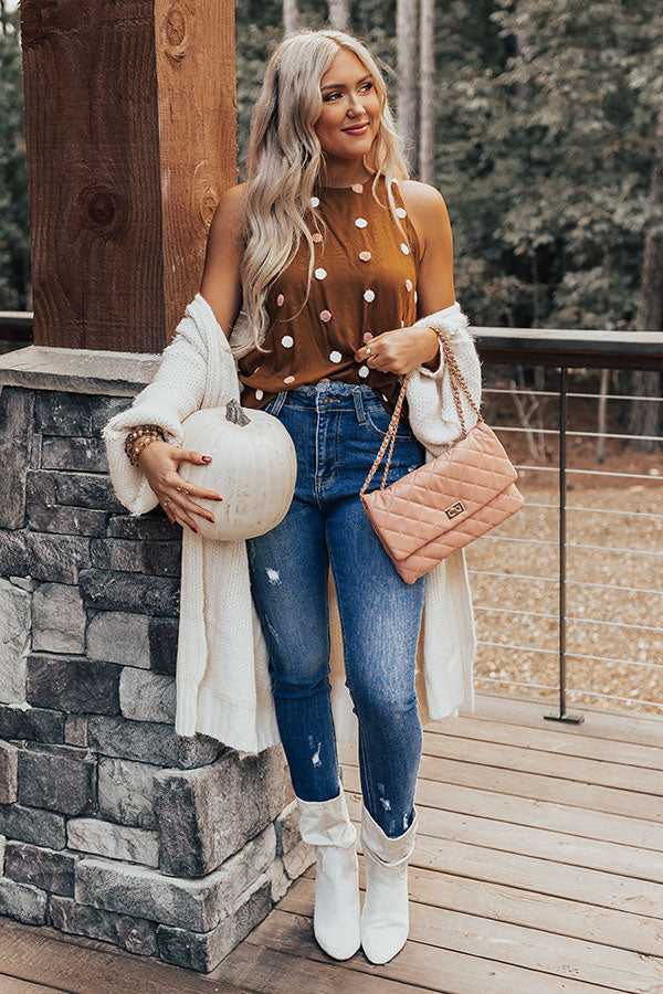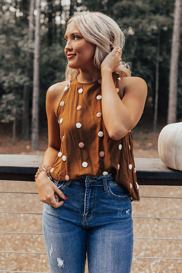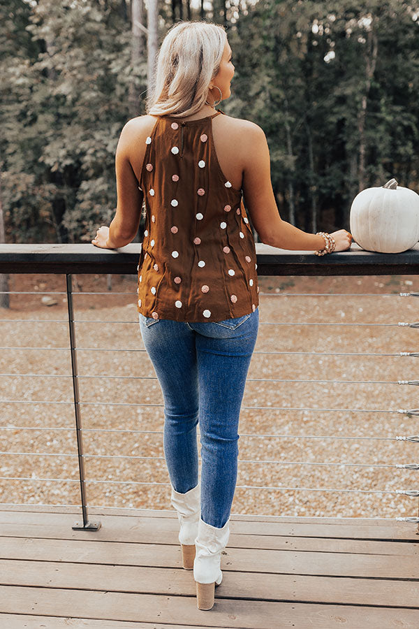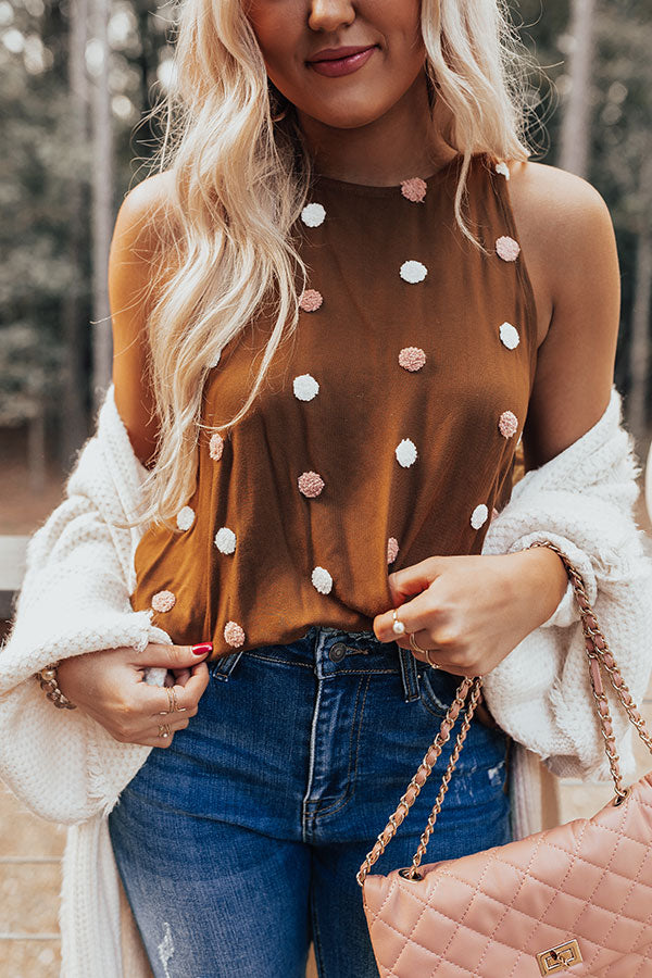 Look your best in this adorable chocolate colored tank featuring lightweight material patterned with white and light pink knit polka dots, a high rounded neckline, sleeveless shoulders that start wide then taper into spaghetti straps, a keyhole accented upper back with a button closure and a racerback fit, and a relaxed silhouette that ends in a straight hemline! Measurements