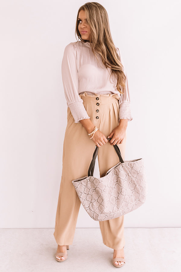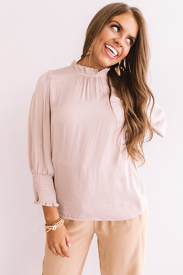 The blush colored "Better In Brooklyn" shift top is the perfect lightweight top for any season with its lightweight semi sheer satin material, a high collared neckline with ruffled trim, a keyhole accented upper back with a button closure, loose quarter length bishop sleeves with smocked cuffs, and an ultra relaxed bodice that falls into a straight hemline! You can dress this piece up for work by tucking it into some neutral hued trousers with simple heels and a snake print tote, or you can keep it casual with some distressed ankle skinnies, "The Camden Sneaker in Wine," and our "Say It Ain't Soho Hat in Wine!" Measurements