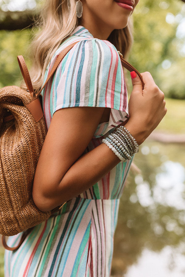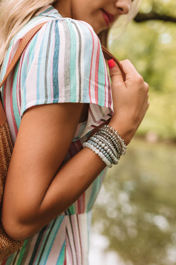 One of the best summer accessories is bracelets and the more the merrier! This dark grey beaded set will add some glitz to any outfit! With the size and shape of the beads varying with each one, there is no doubt this will be one of your versatile go-to summer accessories!