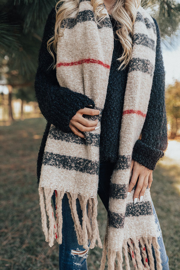 Stay protected from the chilly fall weather with our birch colored "Better In The Snow" scarf featuring ultra soft tight knit material, a black, cream, and red plaid pattern, and long fringed trim detailing!