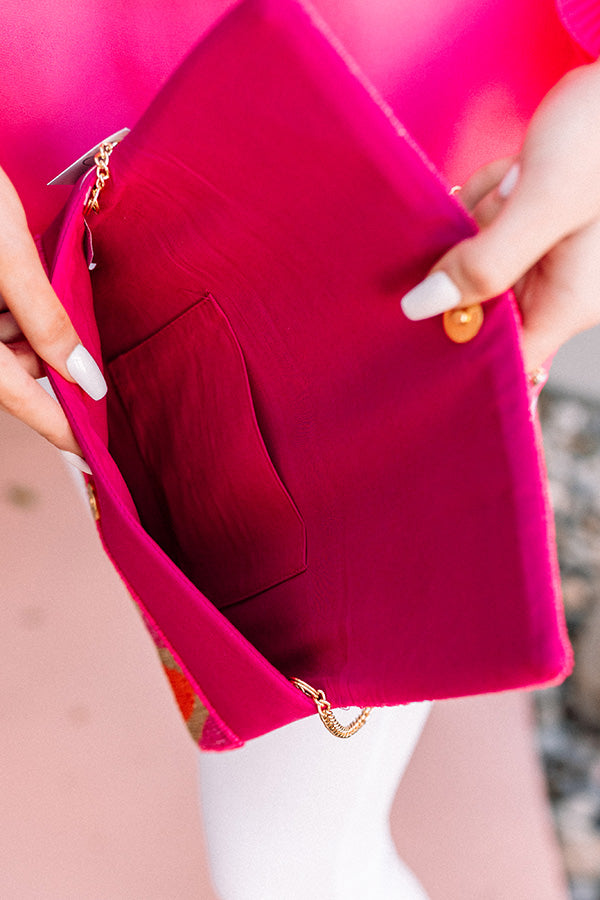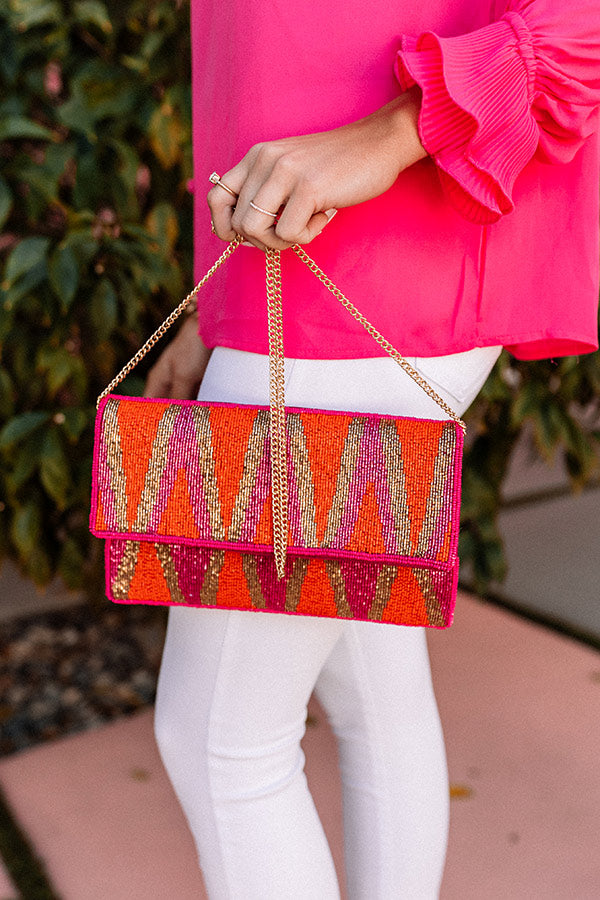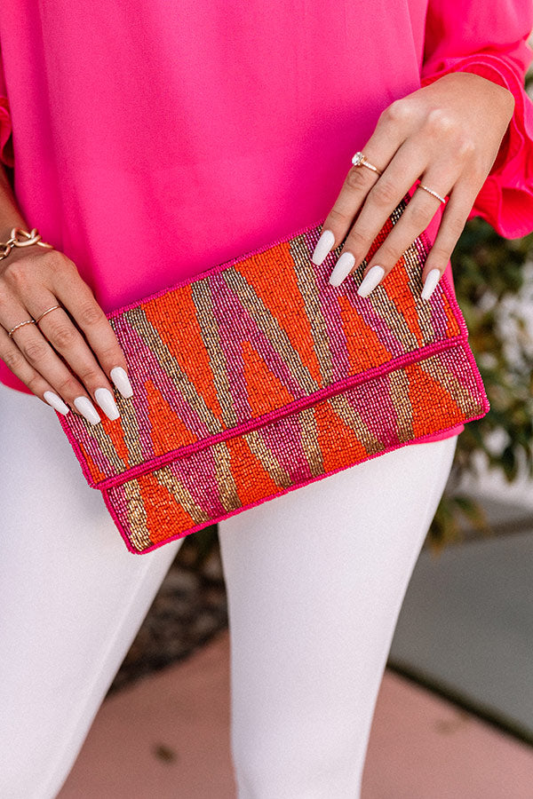 It's a reality that this clutch is even more better in person! This beauty features pink, orange and gold geometric beaded detailing, a rectangular envelope flap closure with a snap button, and a spacious fully lined interior!