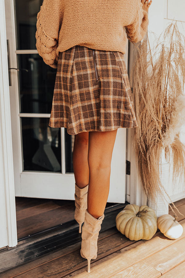 This darling mocha colored skirt will be better than you dreamed with its lightweight material, light natural and white plaid print, a zip closure in the back, and a flirty silhouette that ends in a straight upper-thigh length hemline!