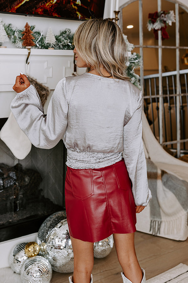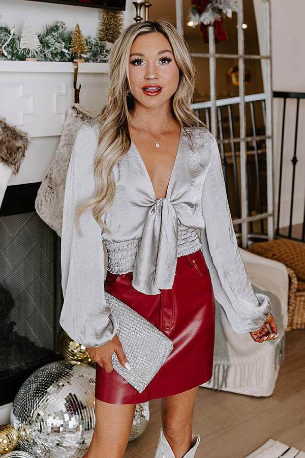 Strike a pose in our adorable grey 'Beverly Drive' top featuring lightweight satin material, a deep v-cut neckline with a front tie detail, long loose sleeves, and a flattering silhouette that ends in a wide smocked hemline!