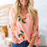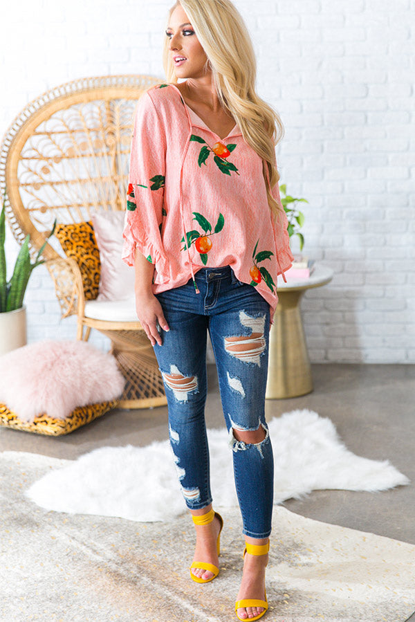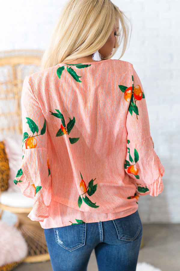 When life gives you lemons... Head to Beverly Hills for brunch! This striped sweetie has a tie neckline, flirty flounce sleeves & a relaxed tangerine printed bodice. Style with your favorite white denim for a look that's perfect for a stroll through your local farmers market, or brunch with your babes!