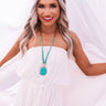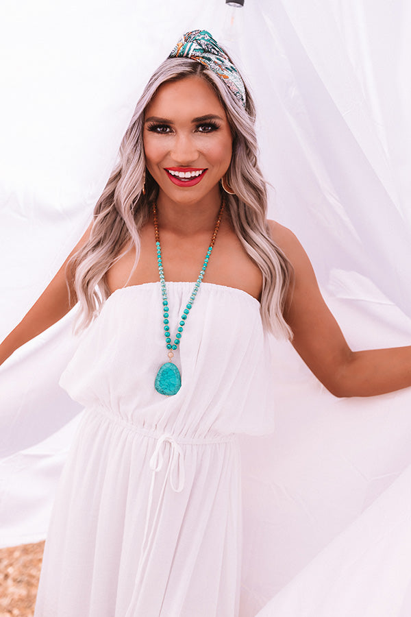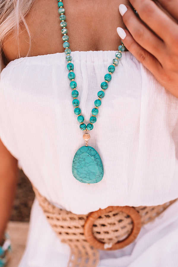 All attention will be on you when you accessorize with our stunning turquoise "Beverly Hills Hideaway" statement necklace featuring a long beaded chain and faux stone pendant!