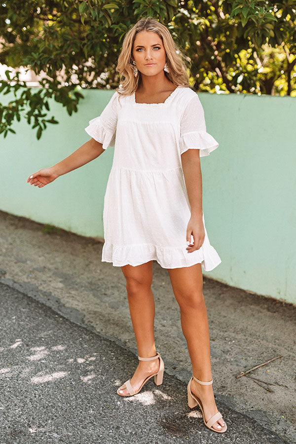 Bring vacay to everyday with our adorable little white "Beyond Bali Shift Dress" featuring lightweight breezy material, a square neckline with smocked detailing, short loose sleeves with flared cuffs, and a relaxed tiered silhouette that falls into an uneven mid-thigh length hemline! We have styled this cutie with a neutral heel and statement earrings, but you can also wear it with "The Tipton Espadrille in Grey," our "Style Profile Faux Leather Tote in Grey," and our "All Caught Up Headband in Grey!" Measurements