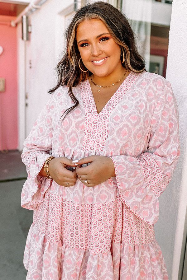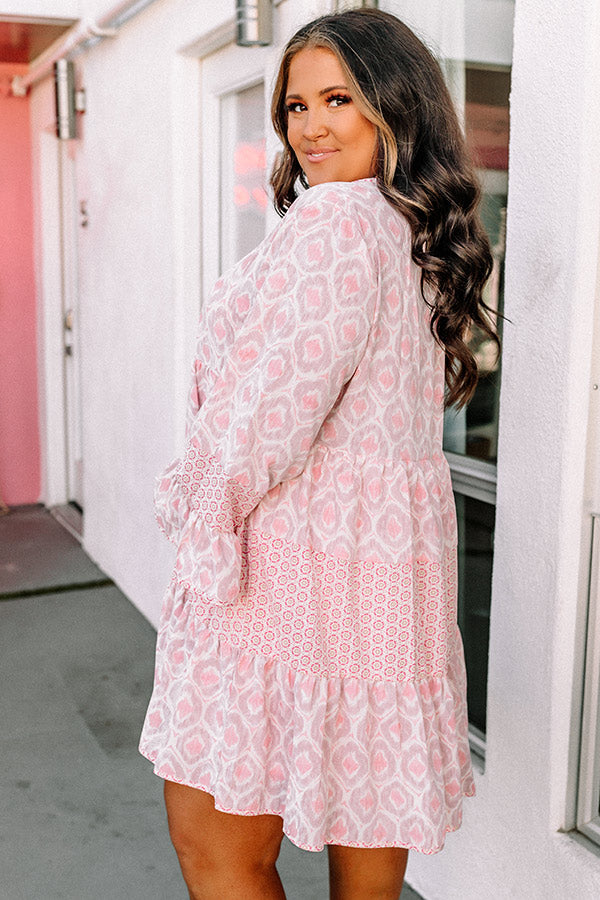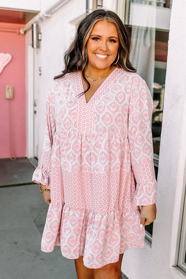 You will look beyond chic in this adorable blush colored plus size dress featuring lightweight material patterned with an abstract diamond print, a v-cut neckline, long loose sleeves with subtly flared cuffs, and a relaxed babydoll silhouette that falls into a straight mid-thigh length hemline!