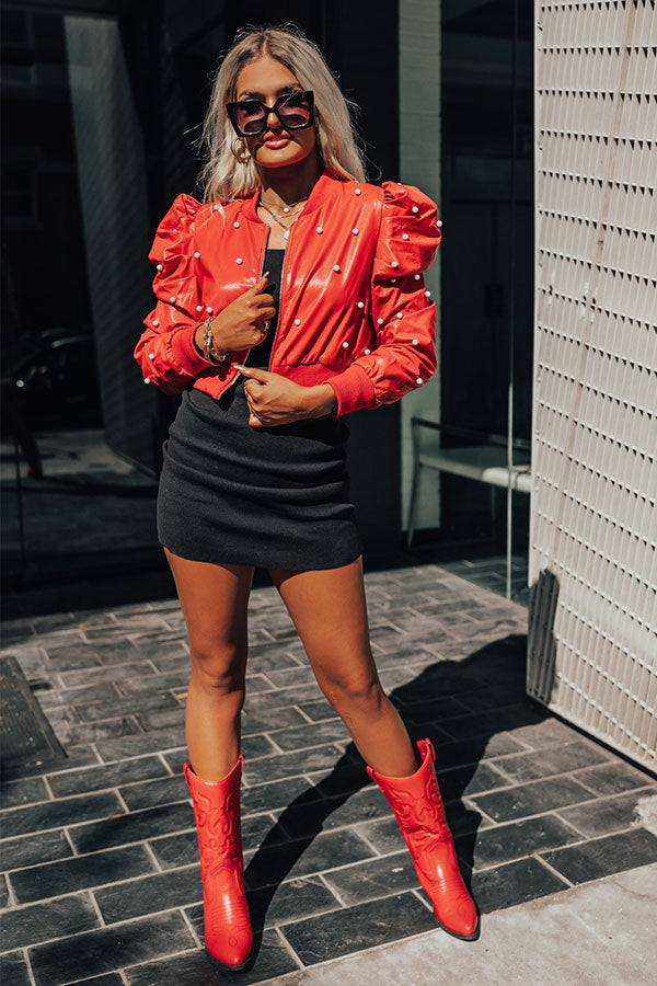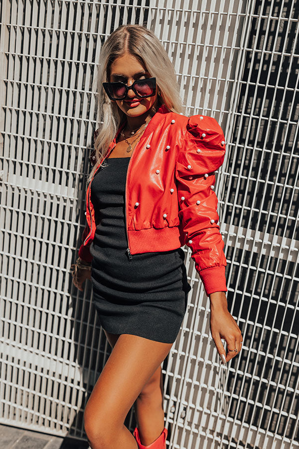You will look absolutely stunning in our trendy 'Beyond City Limits' faux leather jacket! Features an eye-catching red hue with pearl embellishment, v-neckline, fully lined interior, zip up closure, long puffy sleeves with ribbed cuffs, and tapers down into a ribbed waistline.