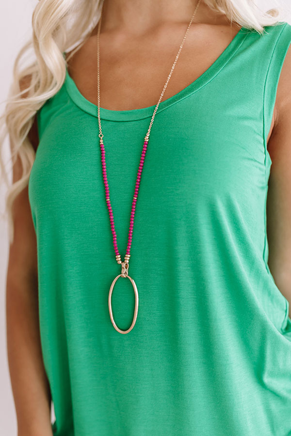 We think you'll agree when we say this necklace is beyond lovely with its long chain, fuchsia beads, and golden oval hoop!
