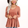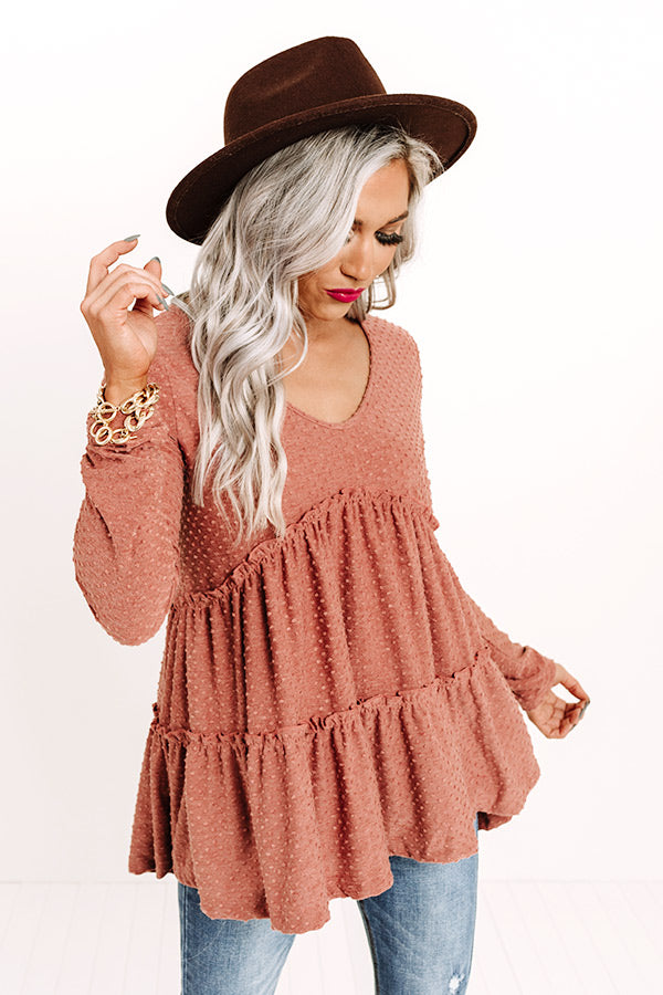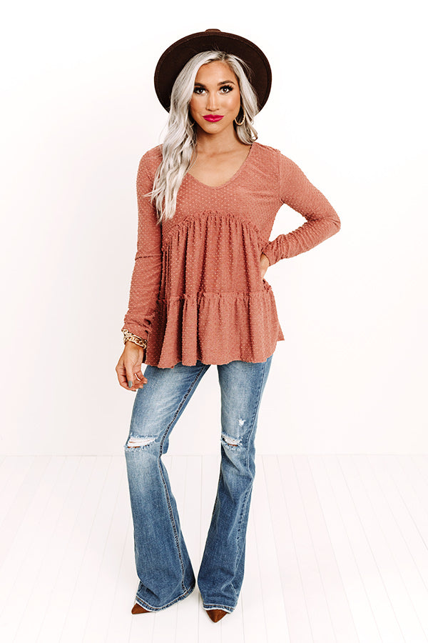 You and this adorable aurora red colored top are about to be 'BFFs,' we just know it! This cutie features, lightweight material, ruffled stitching, a wide v-cut neckline, long sleeves, boucle detailing throughout, and a flowy bottom babydoll silhouette!