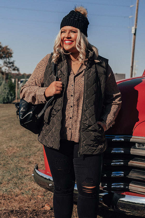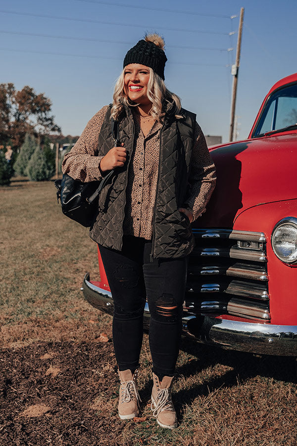 Plus Size - Layer up for the holiday season with our charming dark olive colored 'Big Bear Lake' vest featuring sleek lightweight material with quilted texturing, a zip front closure with a collared neckline, wide 4-inch sleeveless shoulders, accent side pockets with snap button closures, and a flattering silhouette that ends in a straight hemline! Measurements