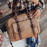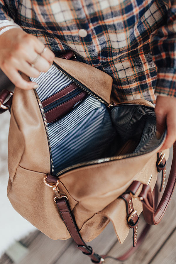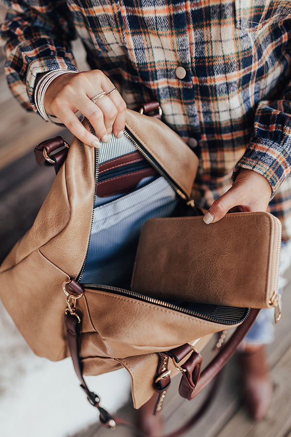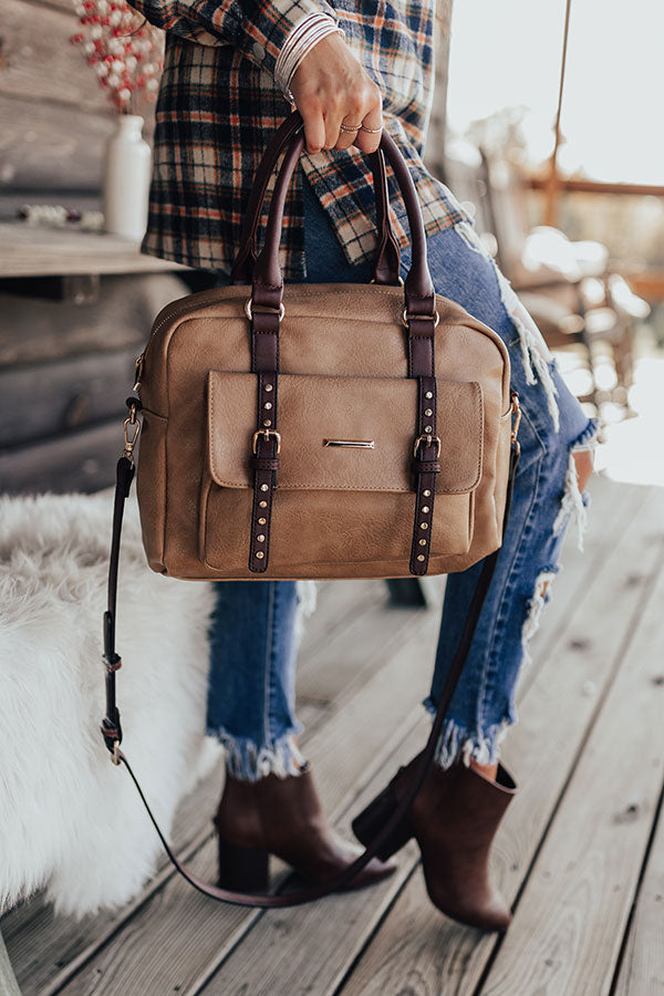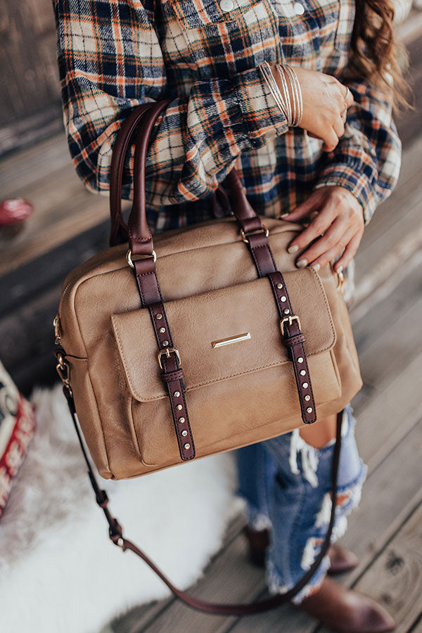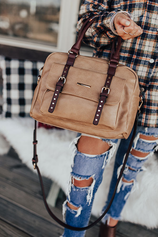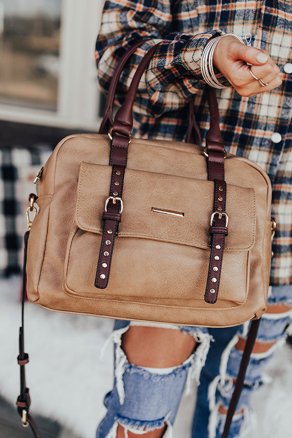Arrive to all your big plans in style with this gorgeous khaki colored tote featuring sleek faux leather material, two tote handles, a large front pouch with a flap closure and two buckle accents, a removable and adjustable shoulder strap, and a spacious lightweight fully lined pouch with additional inside pockets and a zip closure!