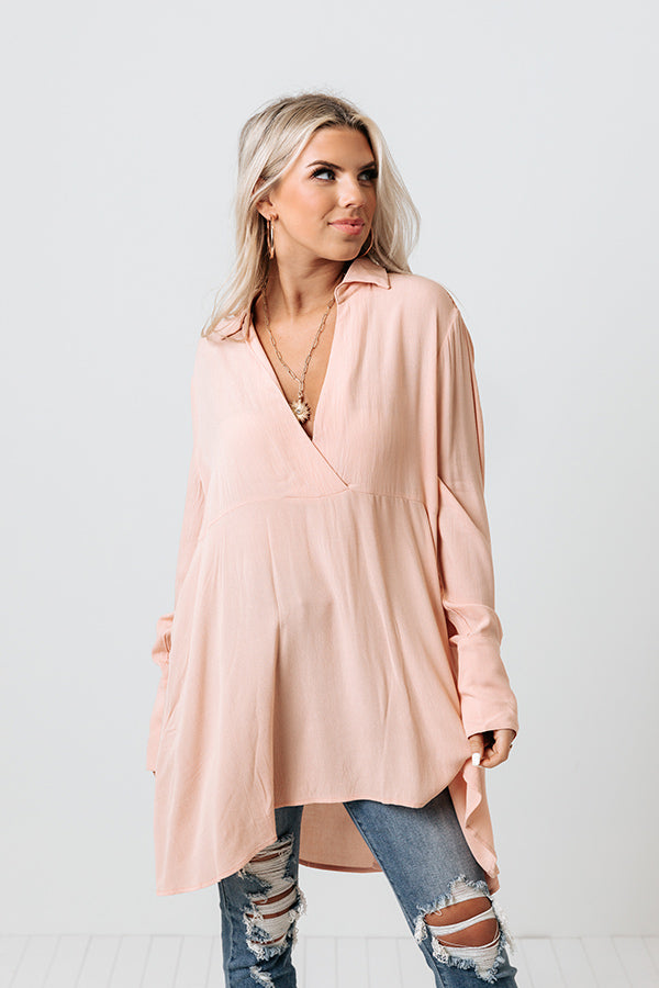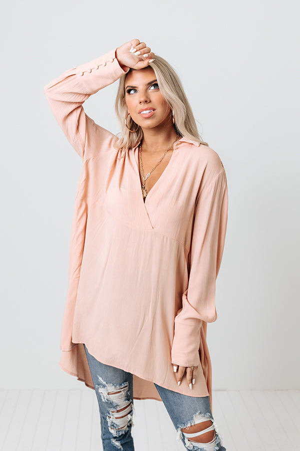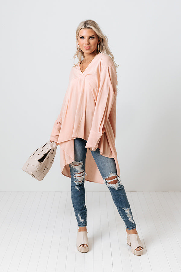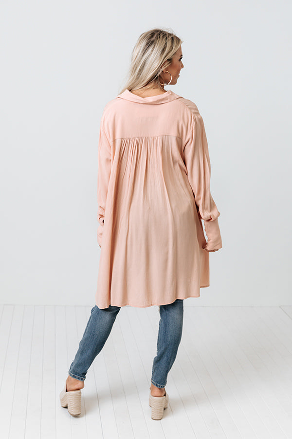 Lighten up your wardrobe with our adorable peach colored 'Biggest Blessings Shift Tunic' featuring lightweight breezy material, a collared v-cut, long loose sleeves with fitted five button closure forearm cuffs, and an ultra draped silhouette that cascades into a rounded high/low mid-thigh length hemline! Measurements