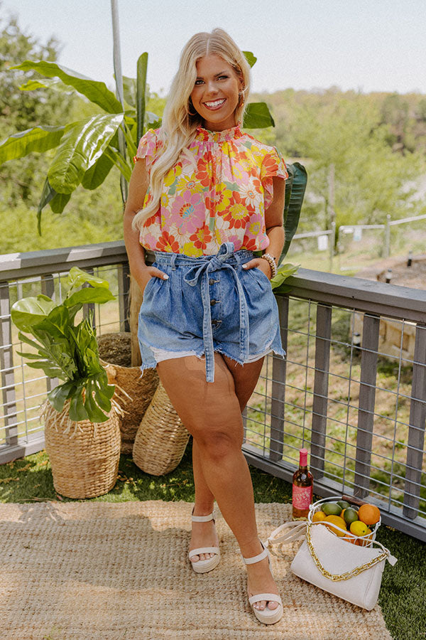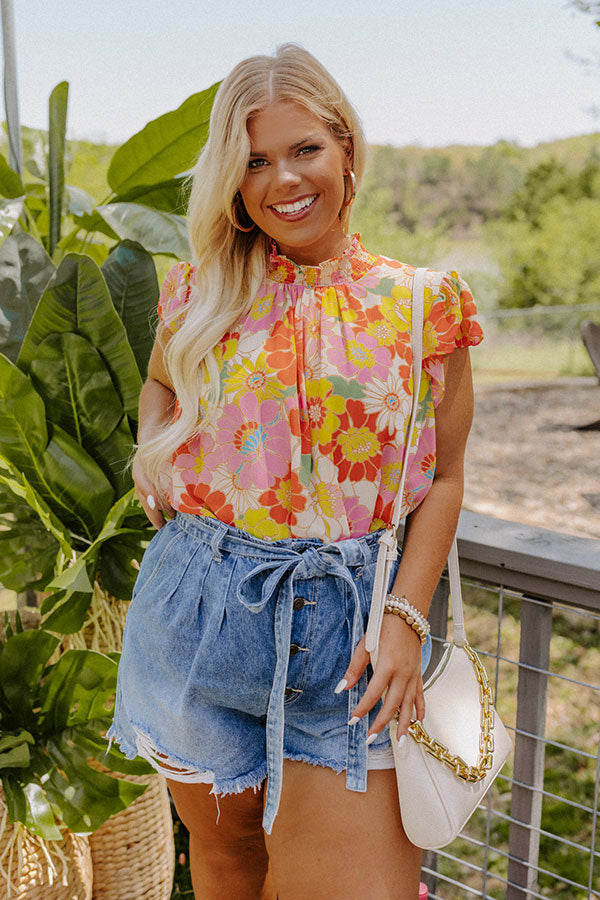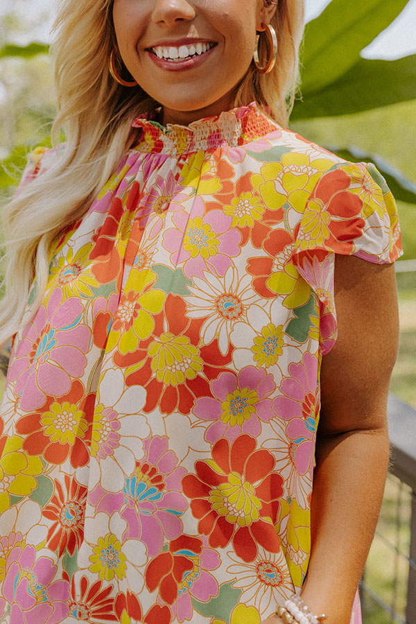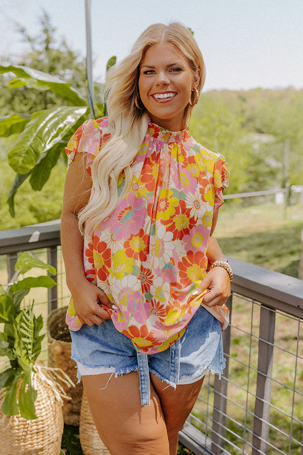 Live life colorfully in our beautiful plus size 'Biggest Claim To Fame' top featuring lightweight material patterned with a yellow, pink, cream, and orange hued floral print, a high ruffle trim neckline, short flowy sleeves, a keyhole accented upper back with a button closure, and a relaxed silhouette that falls into a straight hemline! on products