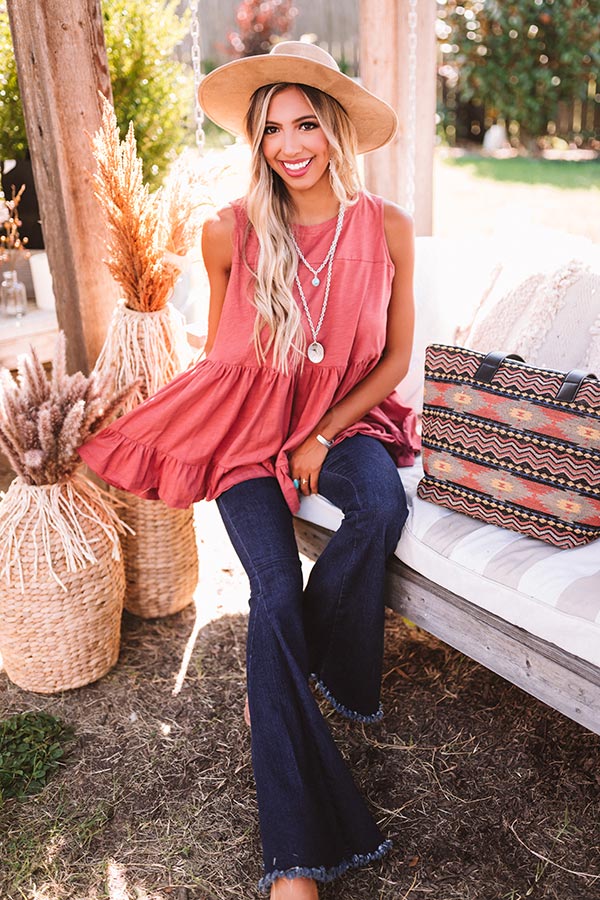 You are sure to be a babe in this adorable aurora red colored top featuring lightweight breezy material, a high rounded neckline, wide 3-inch sleeveless shoulder straps, and an ultra relaxed tiered babydoll silhouette that falls into a wide ruffled hemline! This darling piece styles perfectly with some dark wash flares, turquoise statement jewelry, a matching tote, and a neutral mule heel and wool hat, but you can also wear it layered under a jean jacket with some distressed white shorts and our white "Estelle Bootie!" Measurements