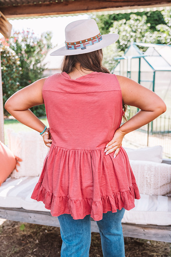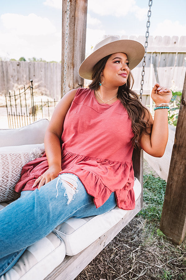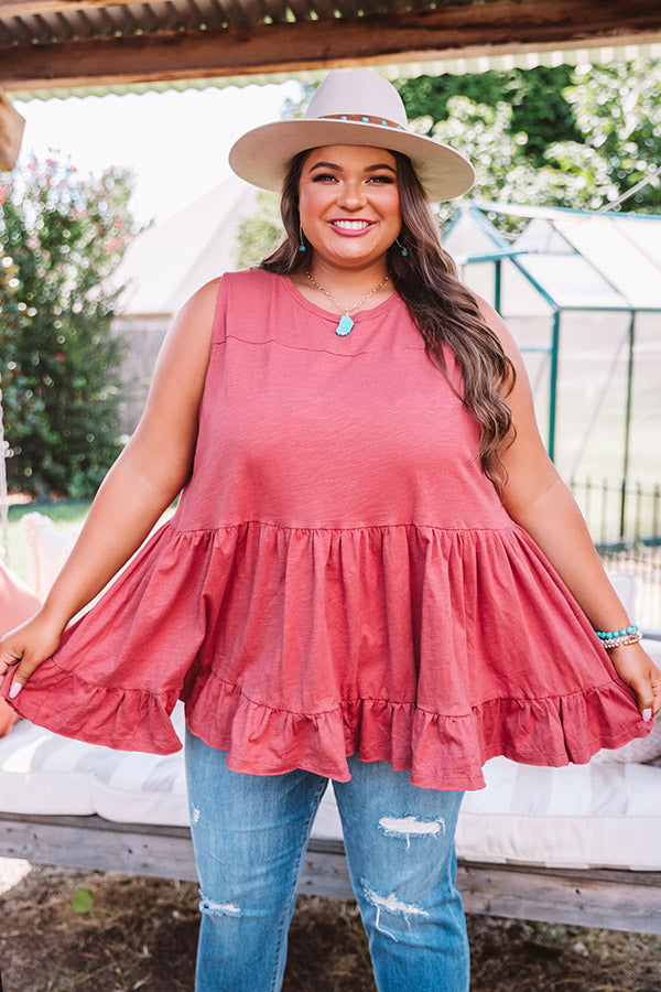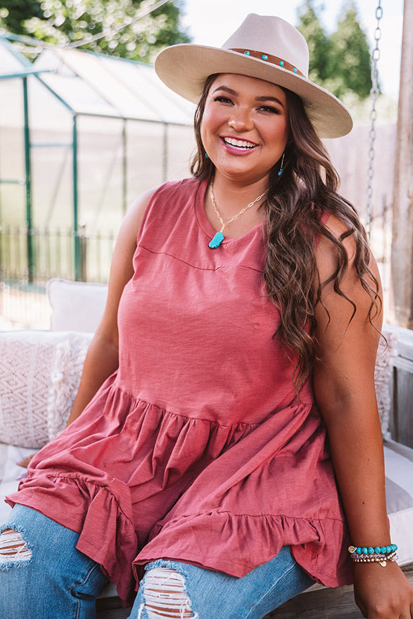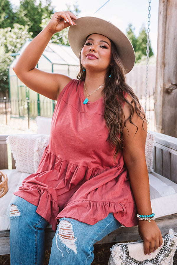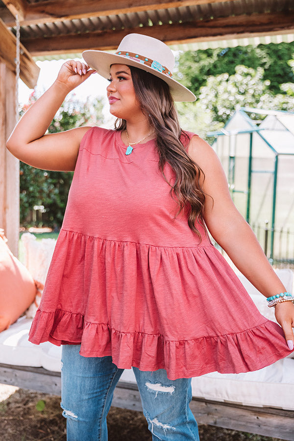 Plus Size - You are sure to be a babe in this adorable aurora red colored top featuring lightweight breezy material, a high rounded neckline, wide 3-inch sleeveless shoulder straps, and an ultra relaxed tiered babydoll silhouette that falls into a wide ruffled hemline! This darling piece styles perfectly with some distressed light wash flares, turquoise statement jewelry, and a matching wool hat, but you can also wear it layered under a jean jacket with some white skinnies, "The Jess Faux Leather Heel in Grey," and our "New On The Block Faux Leather Fringe Tote in Grey!" Measurements
