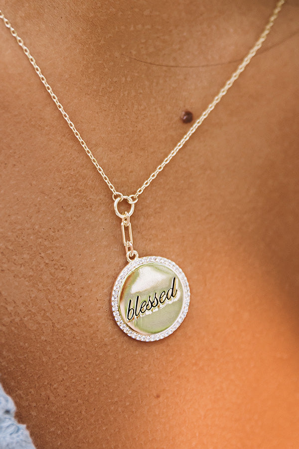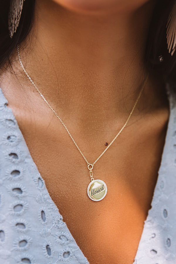 Add a dainty touch to any look with this charming necklace featuring a short gold chain and a gold circle pendant with a"Blessed" inscription surrounded by shimmering rhinestones!