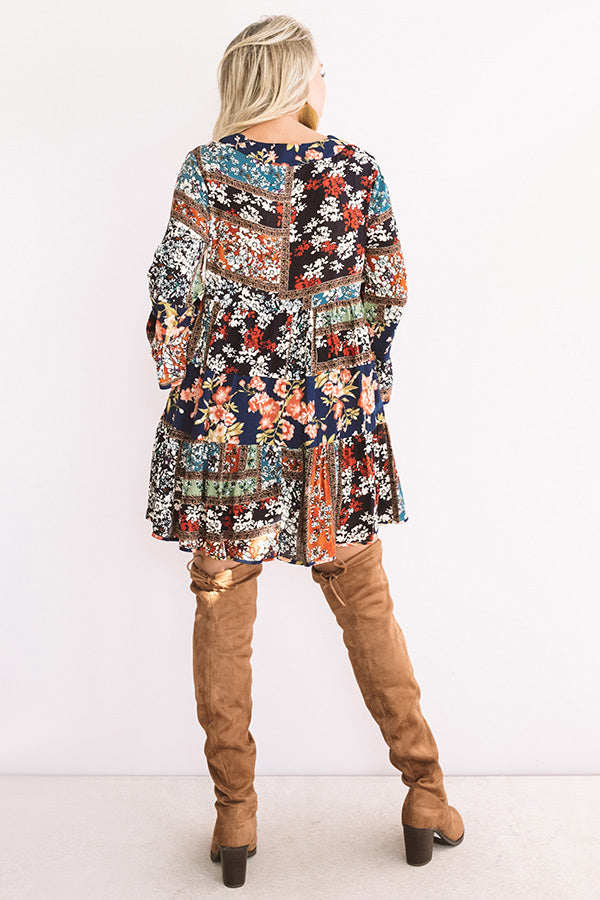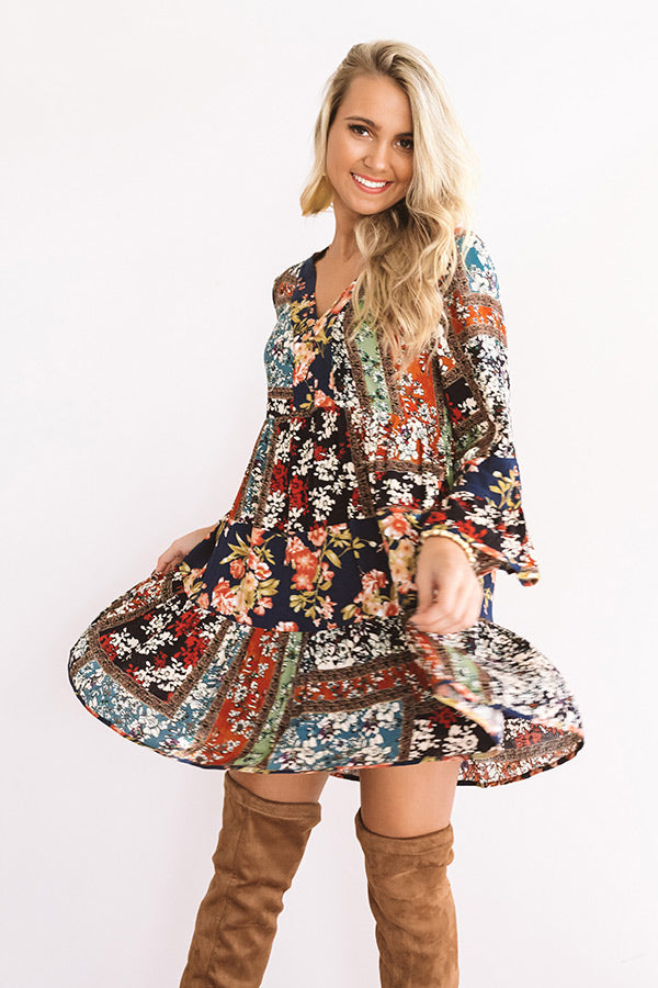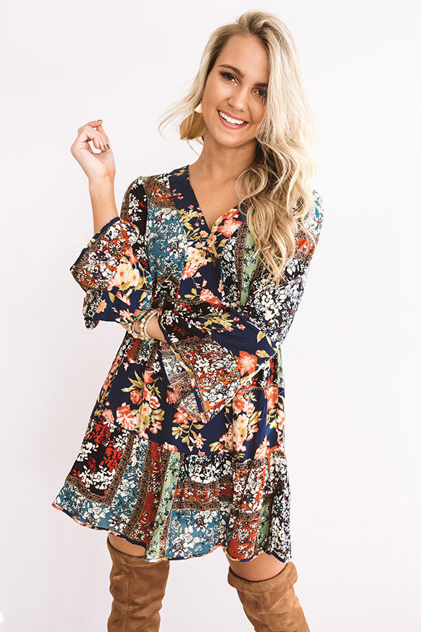 We hope your fall is filled with babydoll dresses, "bliss, and bouquets!" This navy piece features colorful floral patterns, lightweight material, a v-cut neckline, long loose sleeves with flared cuffs, and a relaxed silhouette that falls into a tiered babydoll skirt with a mid-thigh length straight hemline! We have styled this adorable piece under a distressed denim jacket, a neutral over the knee boot, and a matching tote, but you can pair it with "The Lyra Heel in Iced Latte" and our "Vineyard Vibes Tassel Earrings in Navy!" Measurements