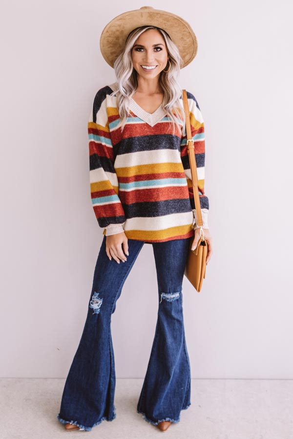 Be your own kind of beautiful our red "Bliss By The Fire" sweater featuring soft lightweight tight knit material, horizontal color block accent stripes, a wide v-cut neckline, long loose bishop sleeves with fitted cuffs, and a relaxed silhouette that falls into a straight high/low hemline with side slits! We have styled this adorable piece with some distressed denim flares, a matching mustard crossbody, and a neutral bootie and faux suede hat, but you can also wear it with some black skinnies and "The Underwood Faux Leather Wedge in Natural!"