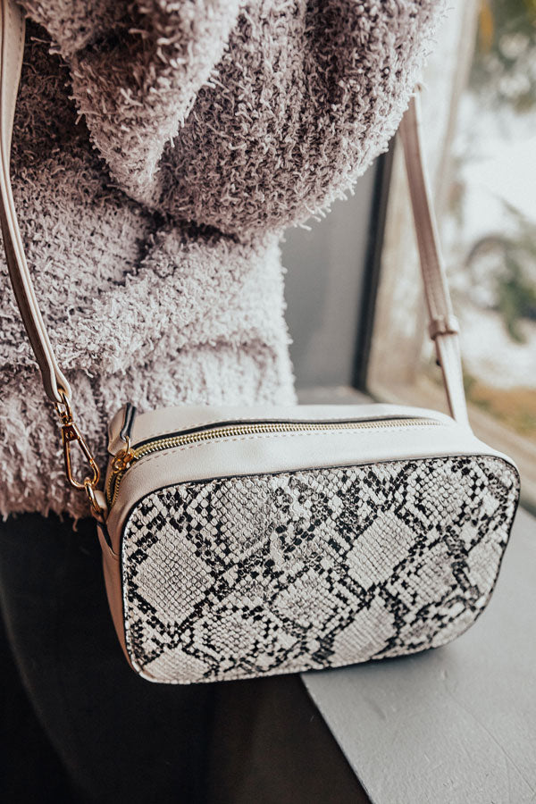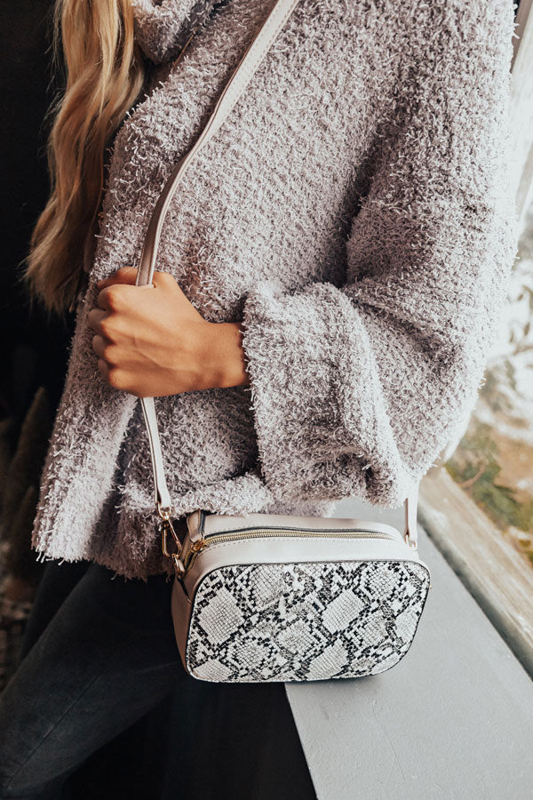 This adorable grey crossbody is sure to make it onto your "bliss list" with its faux leather material patterned with a bold black and white snake print, a removable and adjustable shoulder strap, and a spacious fully lined rectangular pouch with a gold zip-up closure and additional inside pockets!