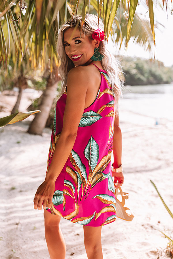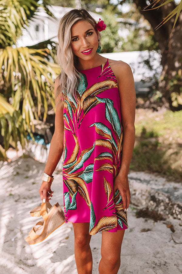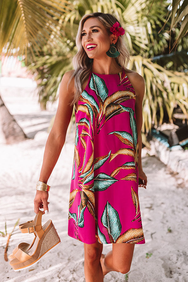 You are sure to feel nothing but "bliss and love" when you wear this adorable fuchsia colored shift dress featuring lightweight breezy material patterned with a large blue and mustard hued palm leaf print, a high rounded neckline with spaghetti straps, and an ultra relaxed silhouette that falls into a straight mid-thigh length hemline! We have styled this tropical cutie with some matching wedges and statement earrings, but you can also wear it with "The Lela Espadrille in White," sunnies, and our "Seaside Bliss Tote!" Measurements