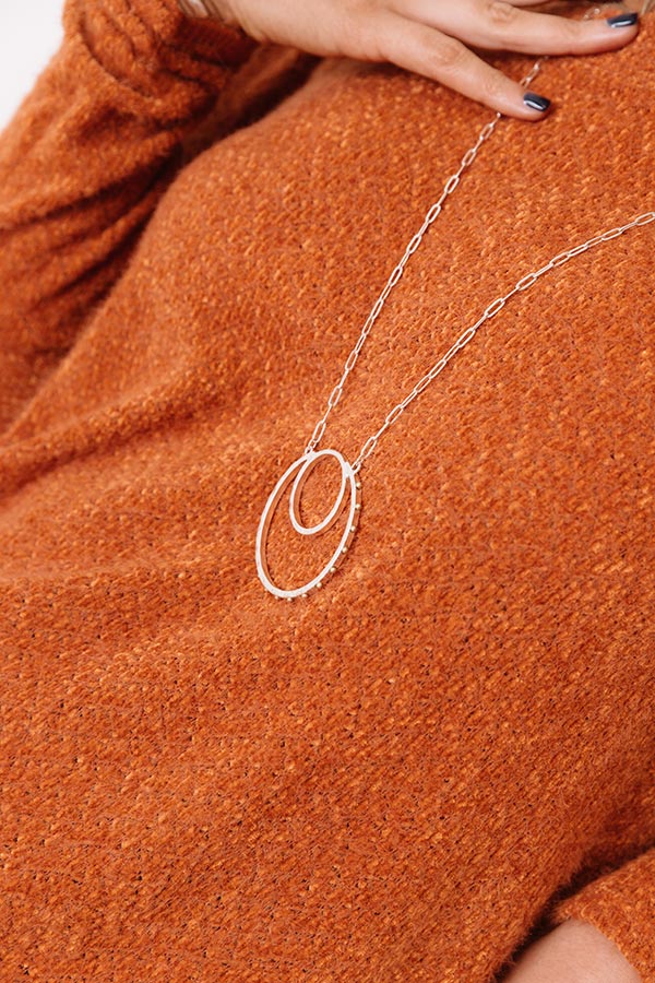 Your OOTD is sure to be blissed out when you accessorize with this silver statement necklace featuring a long dainty link chain with two interlocking hoops!