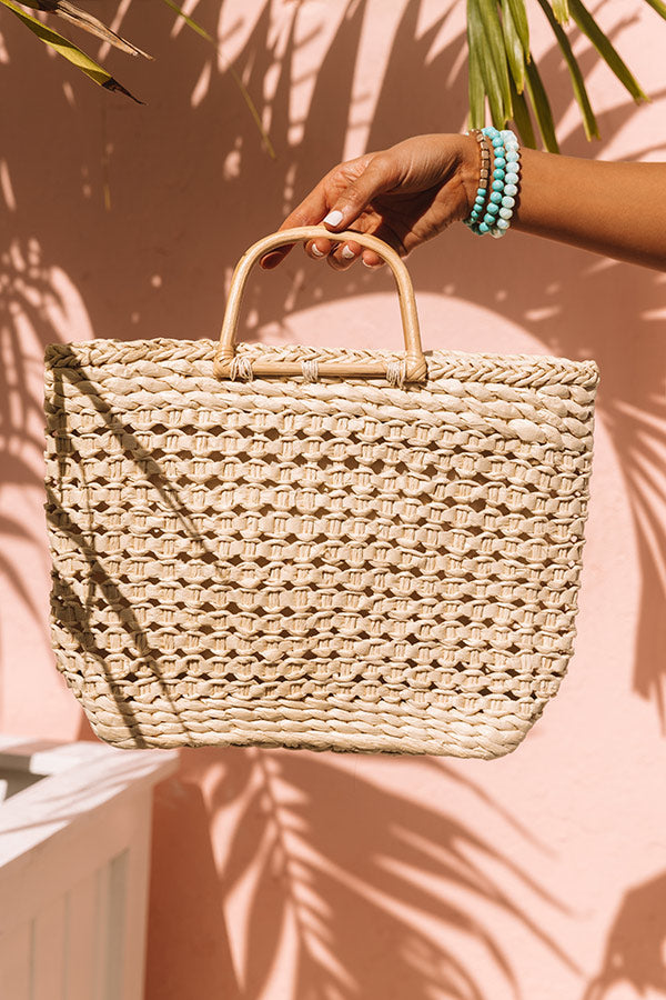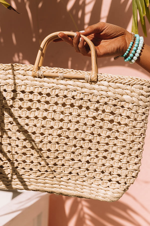 There is no better way to look chic at the beach than by accessorizing with our adorable ivory colored "Blissful Bay" bag featuring lightweight woven straw material, two wooden tote handles, and a spacious rectangular pouch!