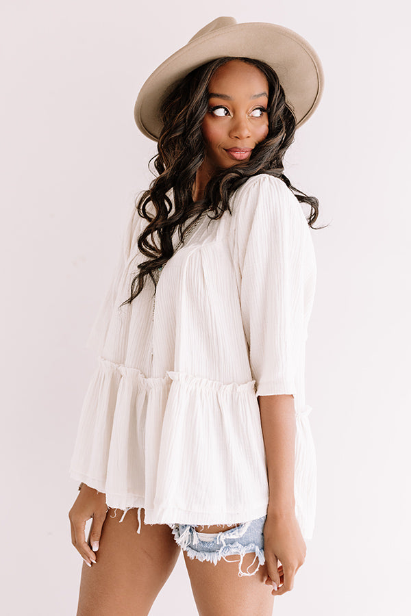 You are guaranteed to look "blissful and beautiful" when you war this charming ivory colored shift top featuring lightweight material with subtle texturing, a high rounded neckline, loose half sleeves, and a relaxed silhouette that falls into a peplum bottom with an uneven hemline! We have styled this flirty piece with some distressed denim shorts, a pear crossbody, and a snake print block heel and faux suede hat, but you can also wear it with some black flares and "The Alba Wedge in Ivory!" Measurements