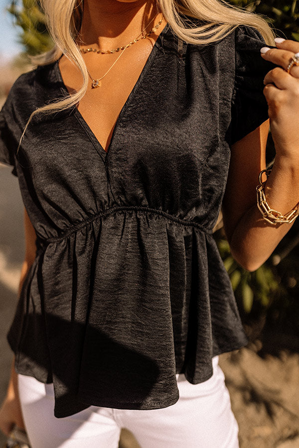 It will surely be a blissful moment when you complete your look with this charming black top featuring lightweight material, a v-cut neckline, ruffled short sleeves, a cinched waistline, and a relaxed babydoll silhouette that falls into a straight hemline!