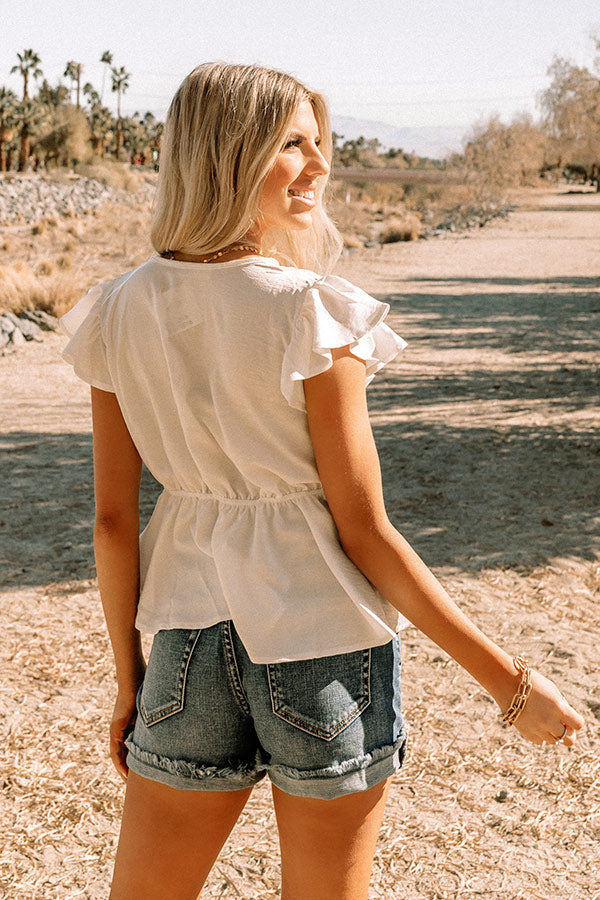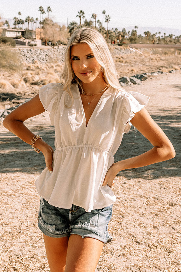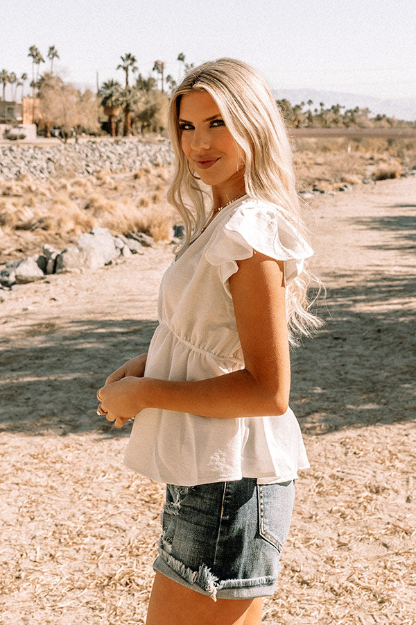 It will surely be a blissful moment when you complete your look with this charming white top featuring lightweight material, a v-cut neckline, ruffled short sleeves, a cinched waistline, and a relaxed babydoll silhouette that falls into a straight hemline!