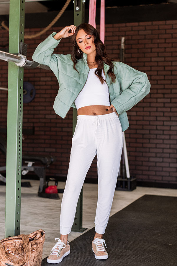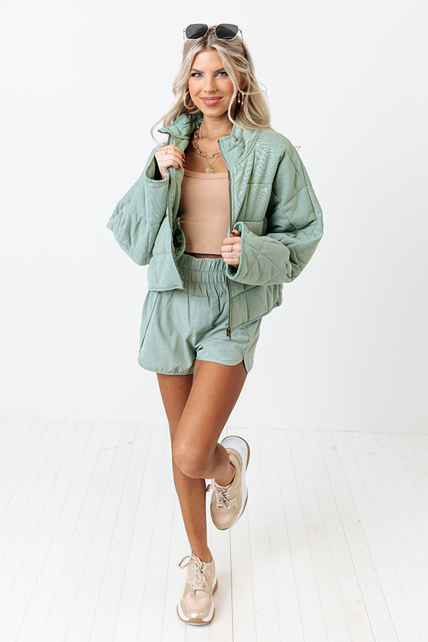 Keep warm all winter long in our stylish pear colored 'Blizzard On Broadway Jacket' featuring warm and thick quilted material, long loose sleeves, a zip front closure with a collared neckline, accent side pockets, and a slouched bomber silhouette that ends in a straight hemline with elastic along the back!