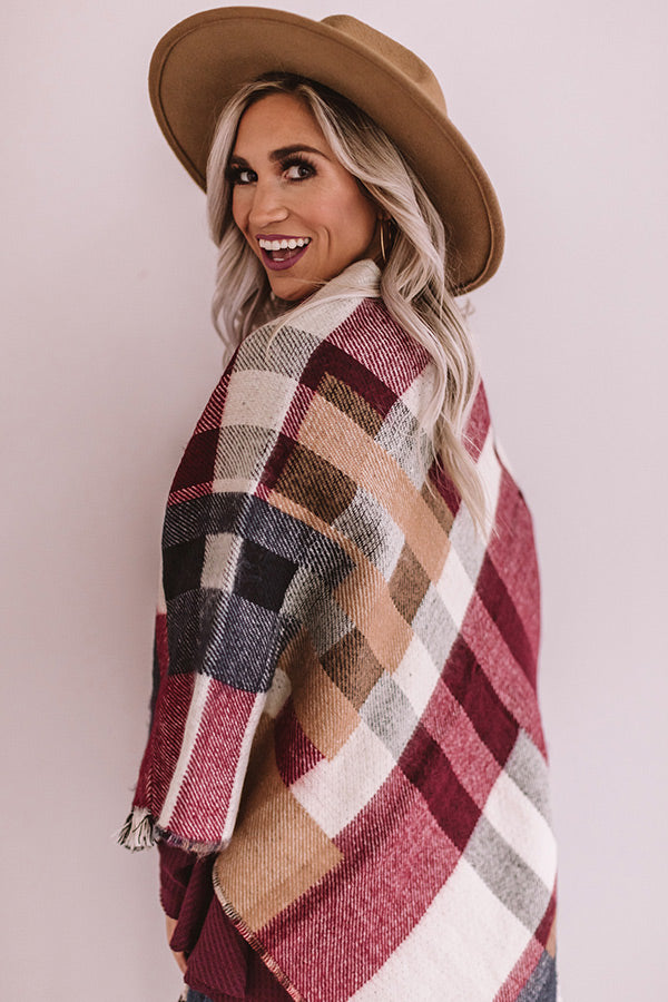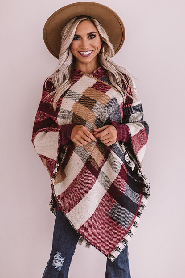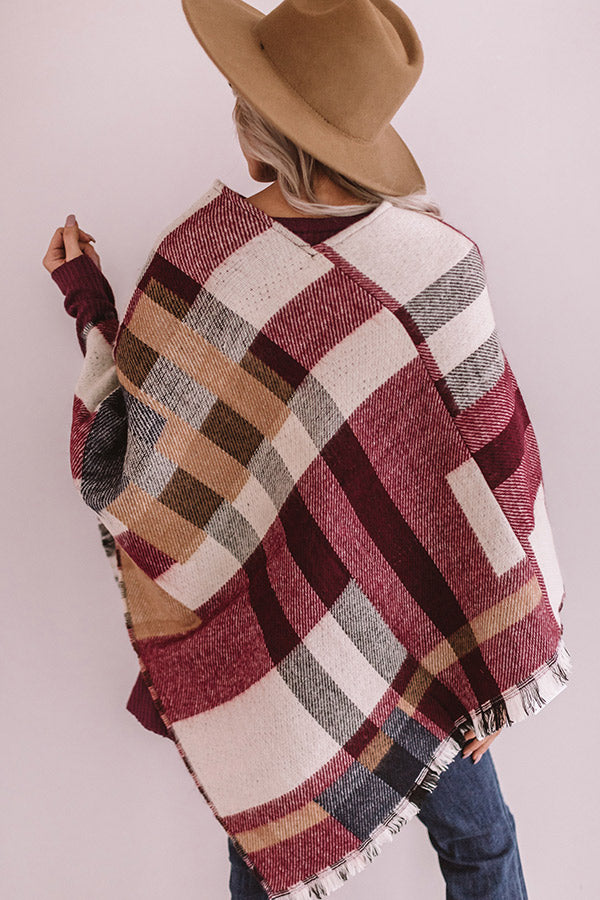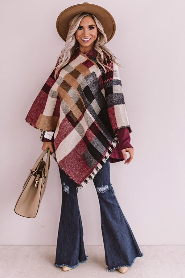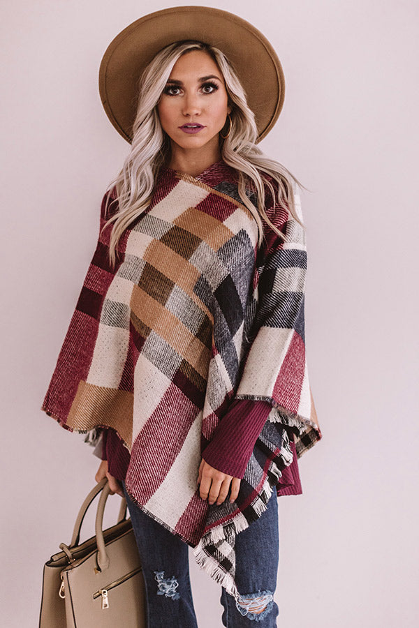 This poncho is so chic people are going to "blog about it!" It features soft lightweight tight knit material, a neutral, black, and wine colored plaid pattern, a high rounded neckline, a black and white buffalo check interior, fringed edge detailing, and an open side silhouette that falls into a draped uneven pointed hemline! You can style this versatile piece with just about anything from a basic tank to a sweater, jeans to skirts or dresses, booties to wedges or sandals, clutches to totes, and hats to earrings! Measurements