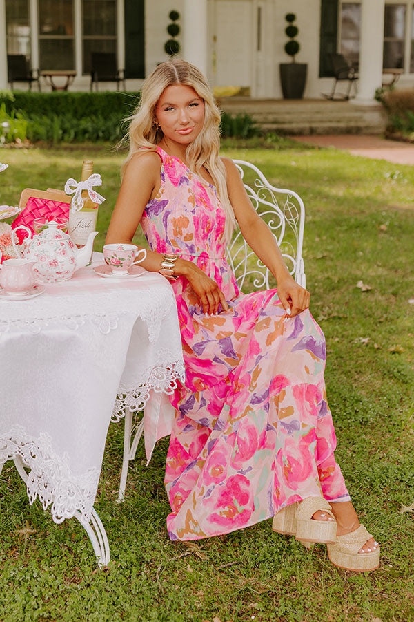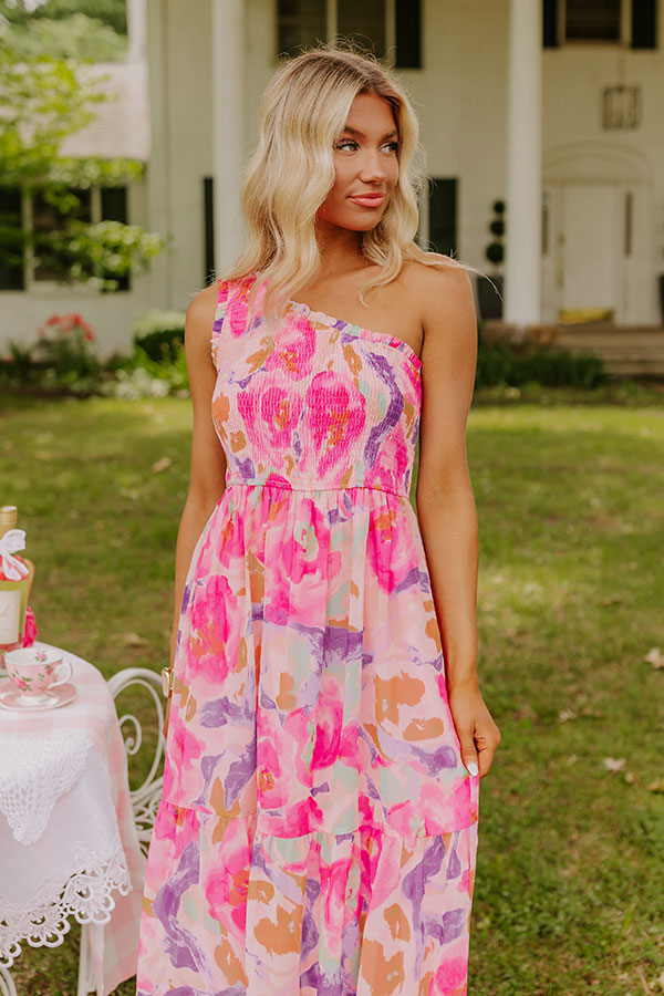 - Get ready to steal the spotlight, darling, because with this flowy one-shoulder beauty, you will be the talk of the town! Its sweet abstract floral print is bursting with colors, creating a look that is as fun as it is fabulous. Whether you are sipping cocktails at a gala or strolling along the beach, this dress is your ticket to effortless elegance and undeniable style. - Chiffon material featuring a yellow, pink, purple, and green hued abstract floral print - An asymmetrical one-shoulder neckline - A single 2-inch strap with ruffle detailing - A smocked bodice - A built-in skirt lining - A flowy yet flattering silhouette that ends in a straight hemline