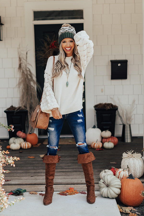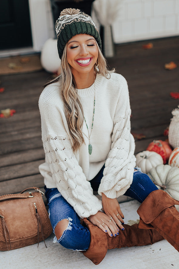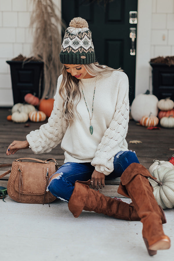 We have no doubt you will look like a total babe in this charming ivory colored sweater featuring soft lightweight material, a high rounded neckline, long oversized sleeves with fitted cuffs and bubble knit texturing, ribbed trim detailing, and a slouched silhouette that falls into a straight hemline! Measurements