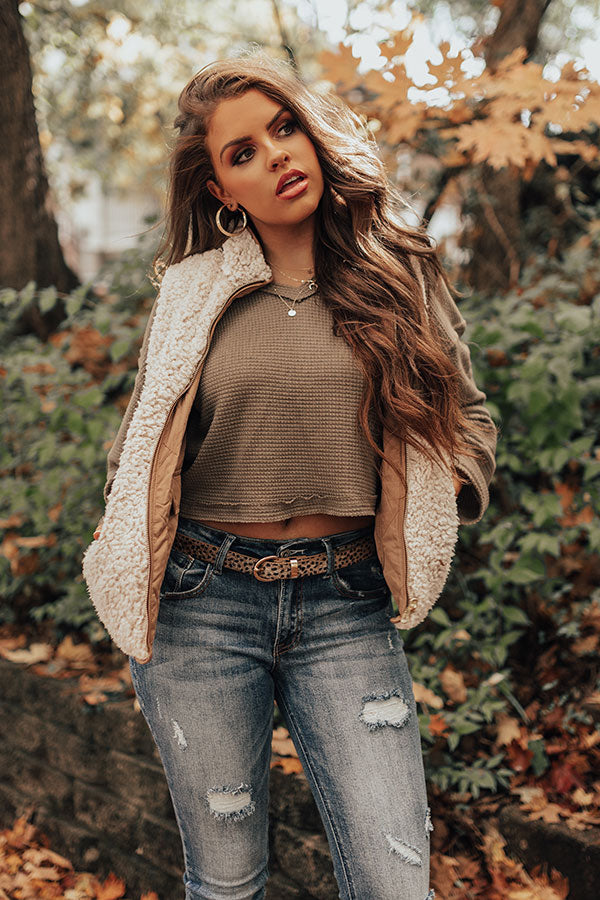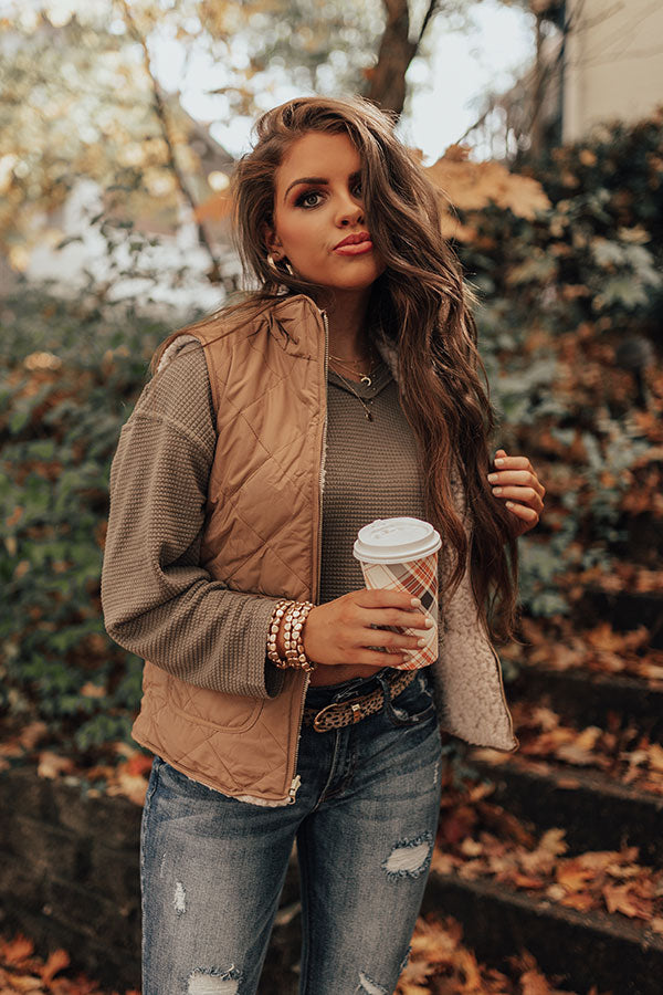 Layer up for warmth with our stylish mocha colored "Blue Ridge Weekend" reversible vest featuring sleek lightweight quilted material with ultra soft white sherpa lining, a zip closure front with a collared neckline, accent side pockets with snap button flap closures, wide 4-inch sleeveless shoulders, and a flattering silhouette that falls into a straight hemline! Measurements