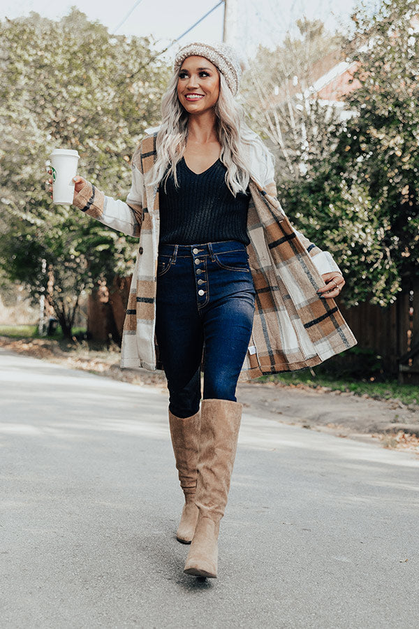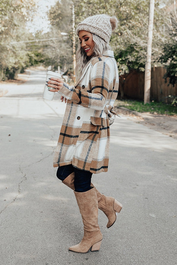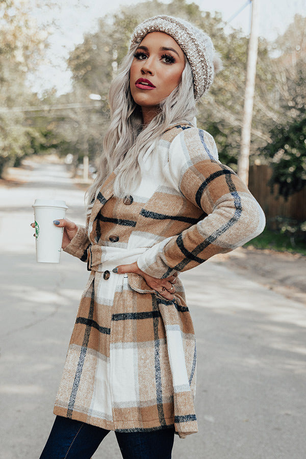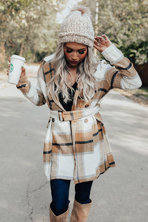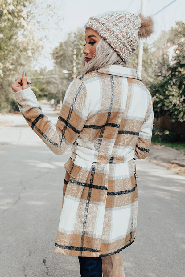 Grab your "boarding pass" and hit the road with this stunning coat featuring thick warm material patterned with a black, white, and neutral plaid print, long loose sleeves, a button up front with a collared neckline, an accent belt, low side pockets with flap closures, and flattering draped silhouette that cascades into a straight mid-thigh length hemline! Measurements