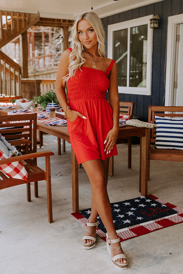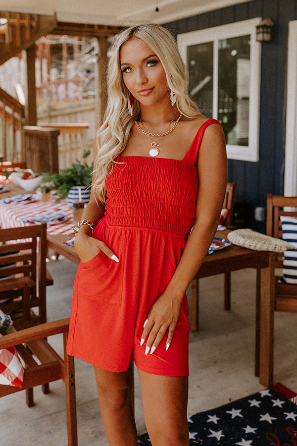 There is no better piece to wear while spending the weekend on the boat than this darling red romper featuring a flattering smocked bodice, a straight neckline and upper back, 1-inch sleeveless shoulder straps, accent side pockets, and a relaxed shorts silhouette that ends in straight upper-thigh length hemlines! on products