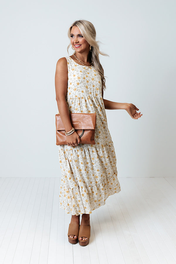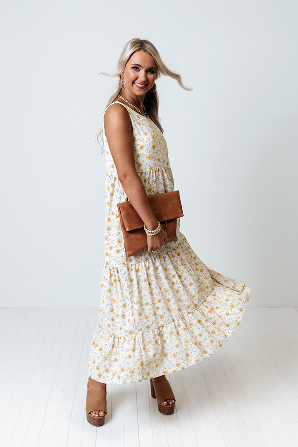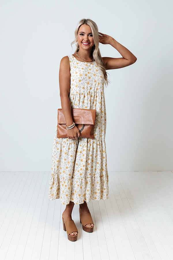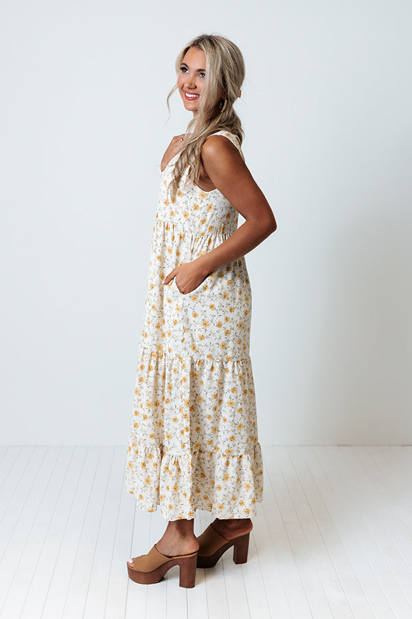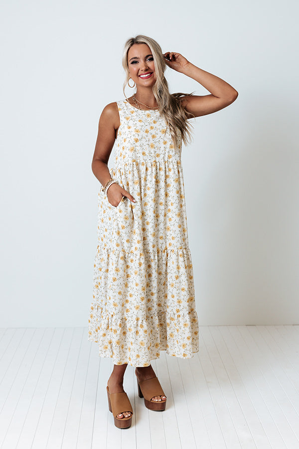Make all your bohemian dreams come true in this pretty cream hued maxi dress featuring lightweight flowy material patterned with a small yellow hued floral print, a rounded neckline with wide shoulder straps, hidden side pockets, and a relaxed silhouette that cascades into a straight ankle-length hemline! Measurements