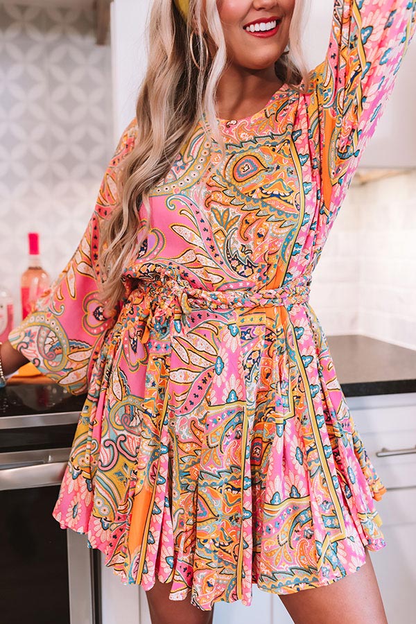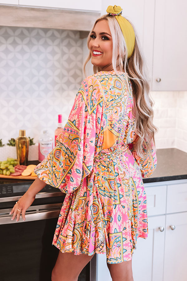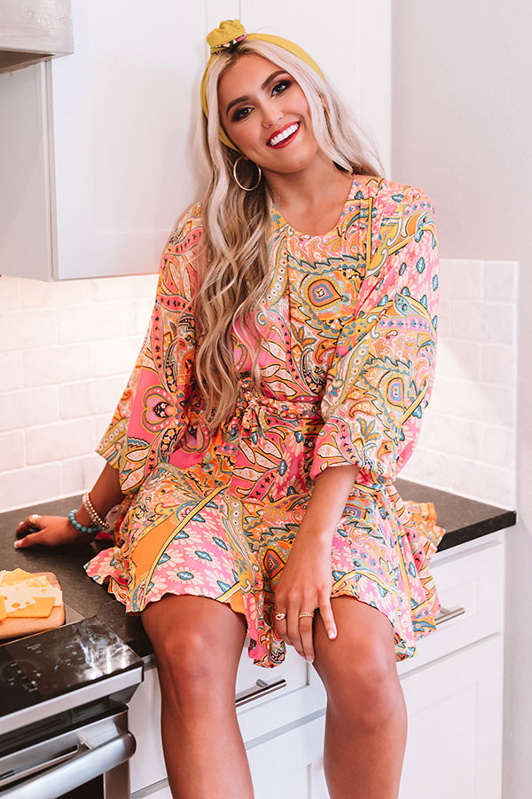 You are sure to stand out in the crowd with our abstract pink "Boho Blooms Shift Dress" featuring lightweight breezy material with an intricate and colorful pattern, a high rounded neckline, oversized 3/4-length sleeves with fitted elastic banded cuffs, a cinched waistline with a tie belt, a keyhole accented upper back with a button closure, and a relaxed skirt silhouette that falls into an uneven mid-thigh length hemline! We have styled this eye-catching piece with matching pink heels and a statement headband, but you can also wear it with "The Allen Wedge in Golden Honey" and our blue "Cayman Views Embellished Clutch!" Measurements