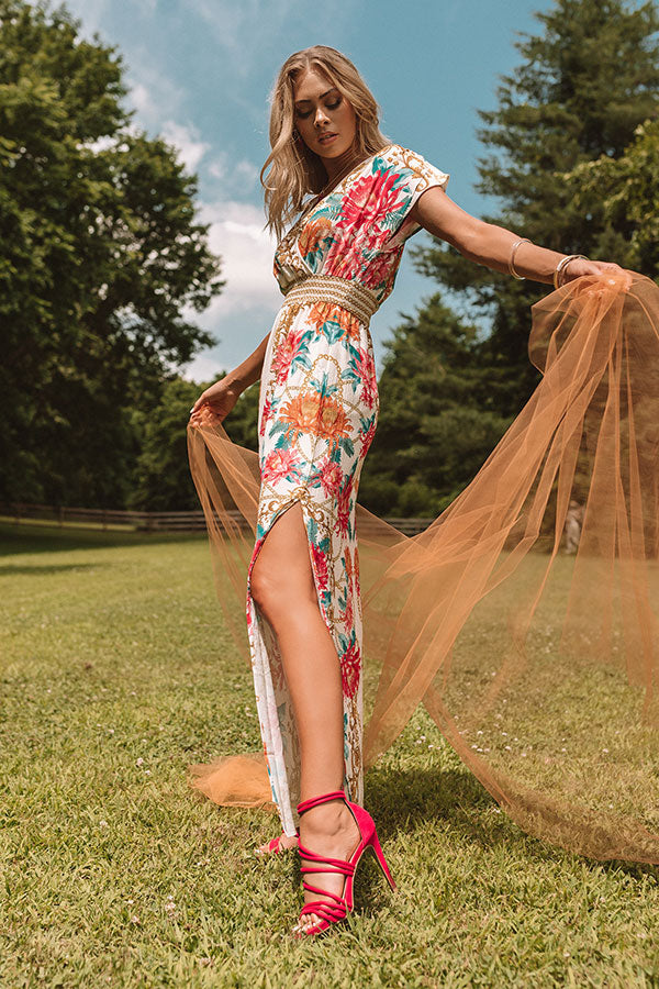 This floral and golden maxi dress is perfect for taking you from breakfast, to the beach, and then to a night out! It has a v-neck, and an elastic waistband that cascades into a flowy skirt with a thigh high slit! Pair with some pink heels and pink jewelry for a beautiful everyday and all day summer outfit! Measurements