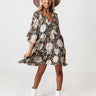 Add a boho touch to your wardrobe with this beautiful black shift dress featuring lightweight flowy material patterned with a pink, cream, light natural, and sage hued floral print, a v-cut neckline, loose half sleeves, and a relaxed silhouette that falls into an uneven mid-thigh length hemline! Measurements