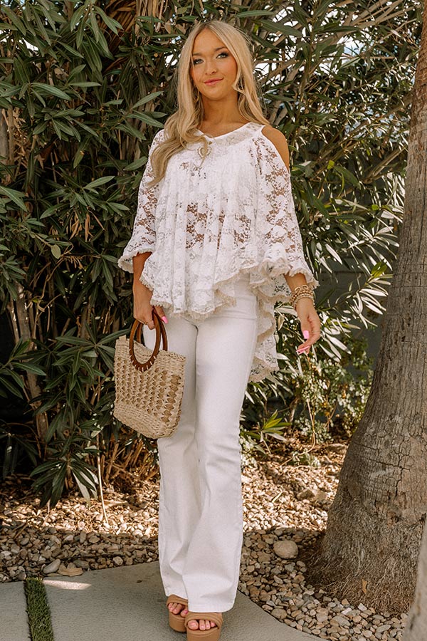 Complete your look in the daintiest of ways with our delicate white 'Boho Kisses' top featuring ultra lightweight semi-sheer lace material, a v-cut neckline, loose 3/4-length sleeves with cold shoulder cutouts, and a relaxed silhouette that falls into a rounded hemline! For additional coverage, we recommend layering over our fave bralette or camisole!